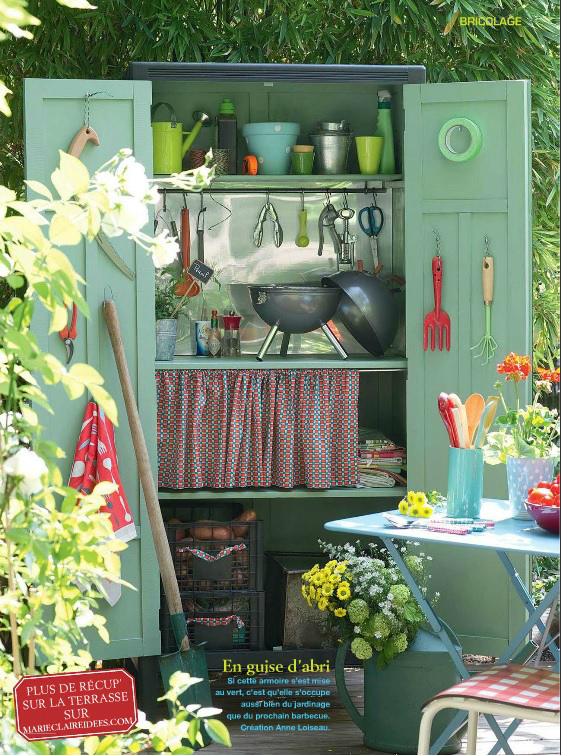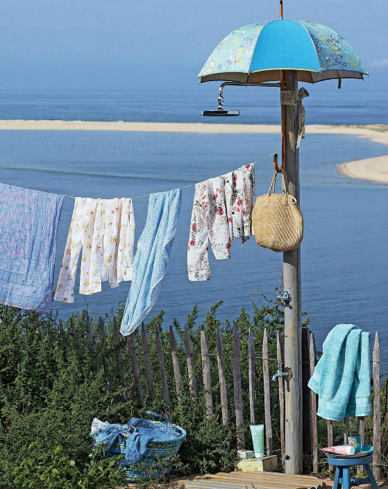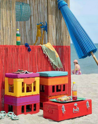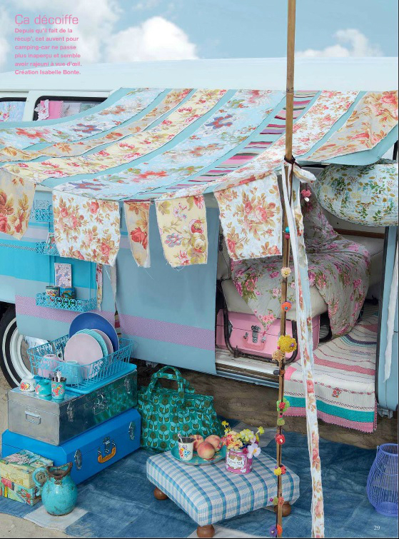 Можете да добавите няколко вещи с които не се разделяте, за да добиете усещането за дома и докато сте до къмпинг. Мушама с десен на плодове и зеленчуци е добра идея. А защо не измайсторите лампиони от цветни кошници, за да шашнете съседите по палатка. Чудесна идея за склад е портативният дървен шкаф. А килимчета от всякакъв вид са добре дошли.