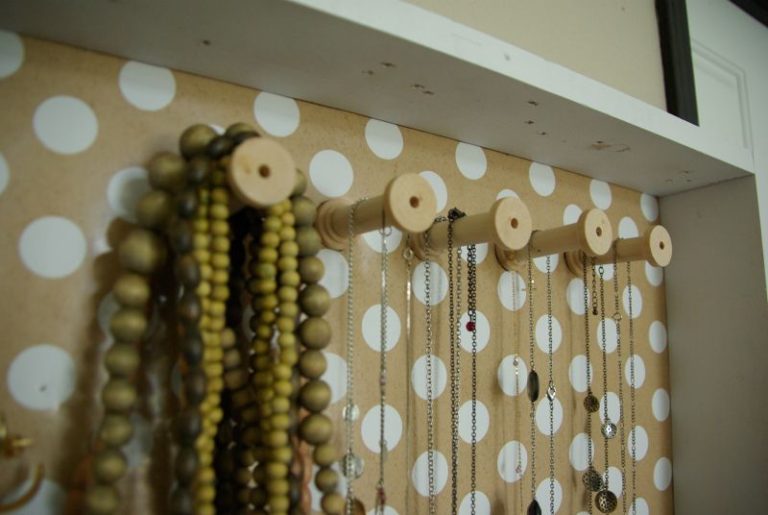 Тези пана от бижута също изглеждат доста нестандартно и стилно, съчетали функция и декор в едно. Изработени са от бяло пано, дървени мъниста и куки за стена. Изглеждат изчистено и красиво, и наистина поставят фокуса върху бижутата, които съхраняват.