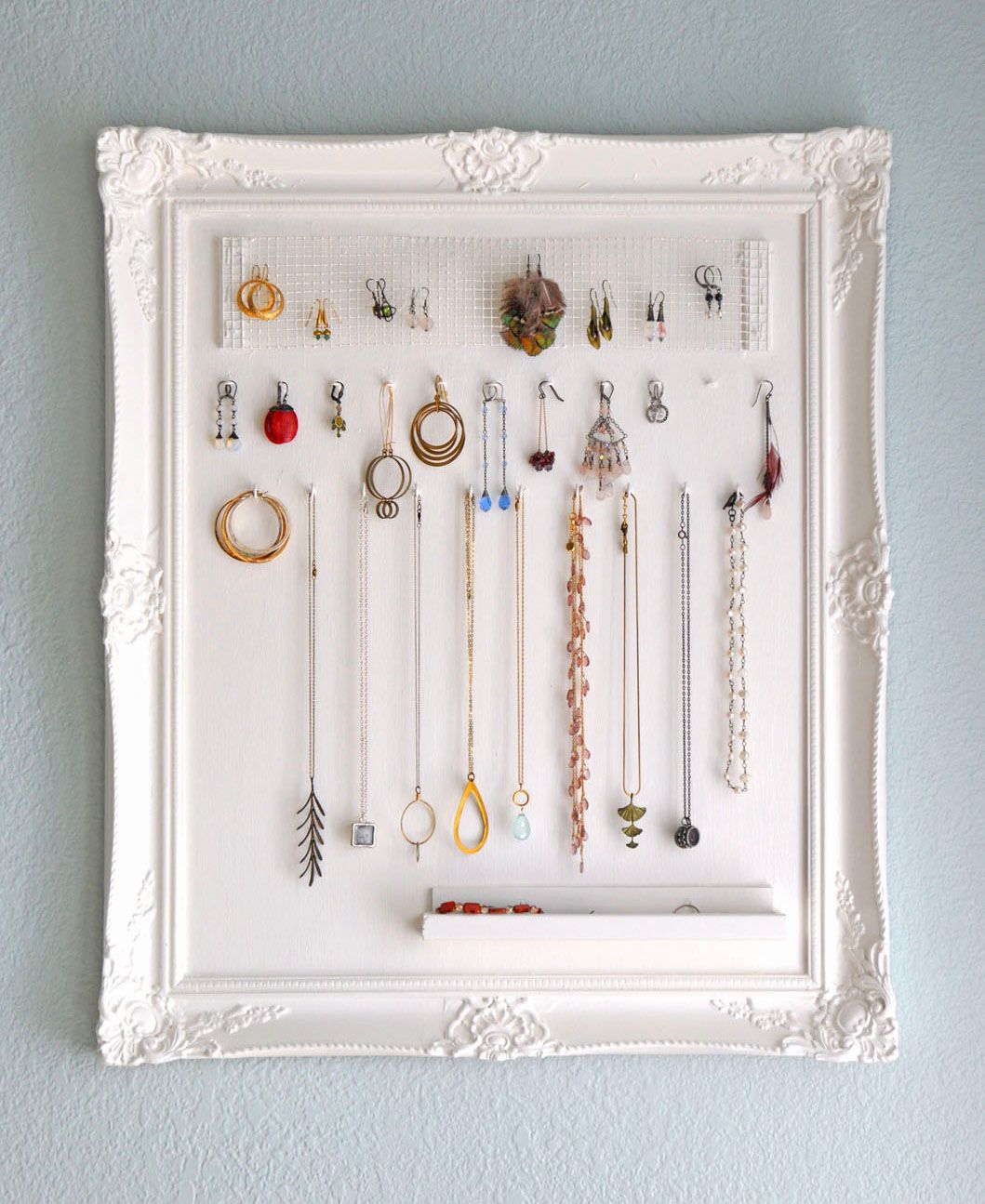 Този органайзер за бижута от “monaluna” е едновременно елегантен и практичен. Забележете малкото, подобно на пепелник отделение в долният ъгъл. Отлично е за съхранение на медальони и други дребни бижута и аксесоари. Очарова ни още факта, че дизайнерите са решили да боядисат рамката и гърба в бяло. Можете да използвате пергаментна хартия, за да състарите рамката и да постигнете малко по-ретро дизайн. Закачалката за бижута може да е нещо толкова просто като парче дърво. Всъщност, това е доста добро описание на проектът от “asmithofalltrades”. Както виждате, не са ви нужни много материали, за да си произведете нещо подобно сами. Така че намерете си дъска, лакирайте я или я боядисайте, пробийте дупки в двата края, за да можете да я окачите и накрая завийте няколко куки или каквото подходящо намерите и комбинирате, които ще служат за същинските закачалки на бижута.