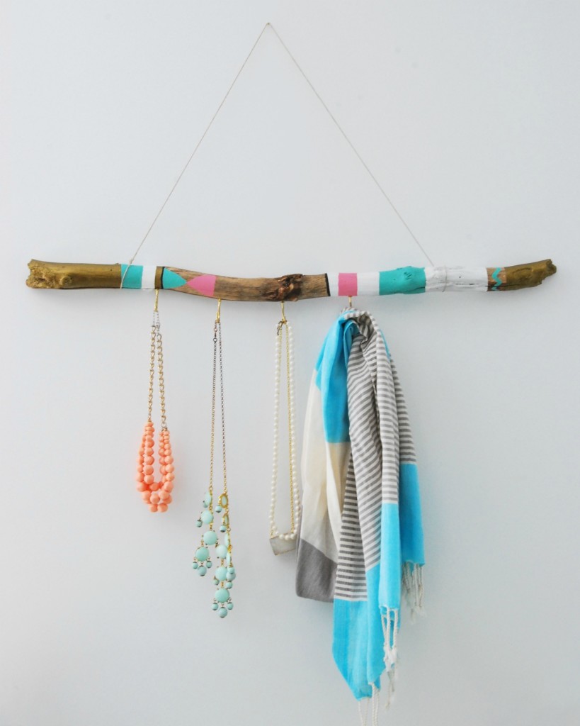Ако успеете да намерите парче дърво изхвърлено от морето по време на лятната почивка или паднал клон на дърво с подходяща форма и размер, то това може да е бъдещата ви закачалка за бижута, прекрасна и лесна за направа. Отнесете я у дома, почистете я и я декорирайте с малко боя и фолио, завинтете няколко кукички с резба от долната страна, на които ще окачите колиетата си и я окачете на стената с помощта на връв или корда.