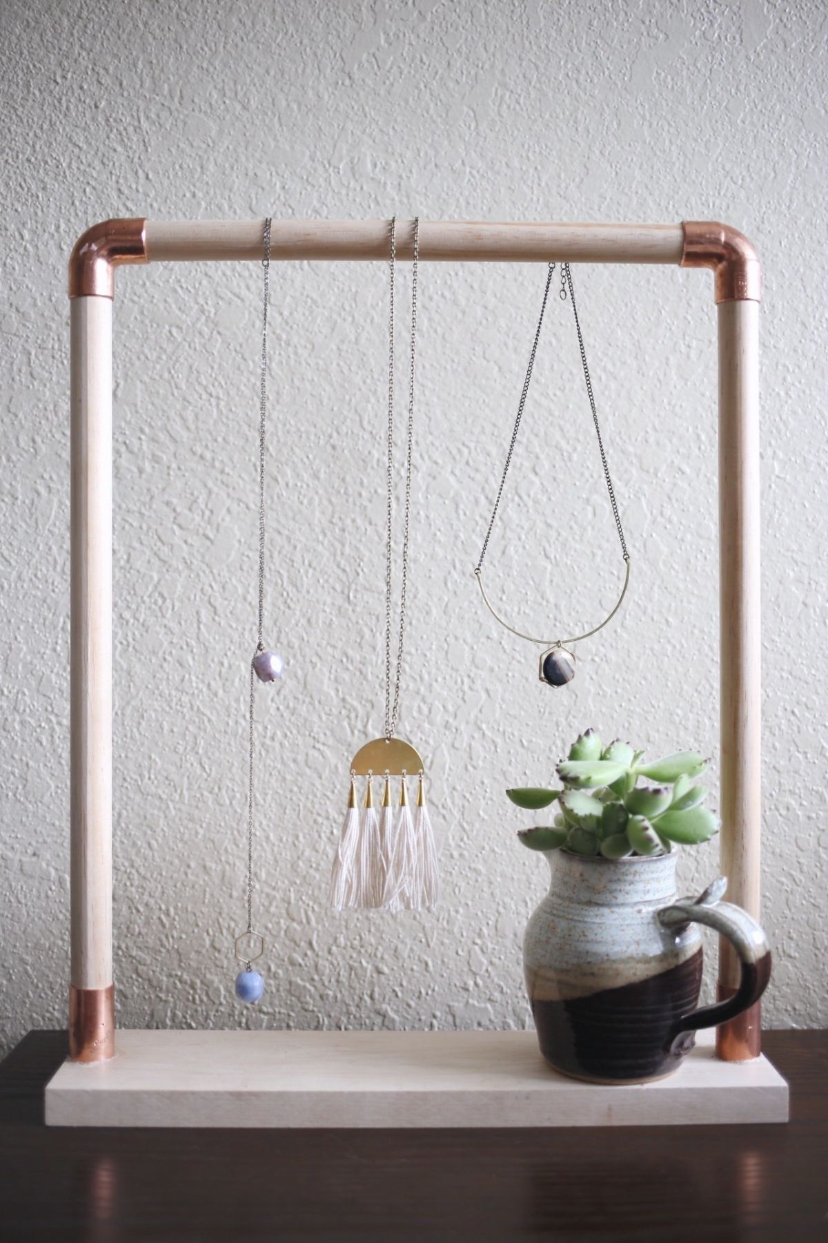 А какво ще кажете за закачалка за колиета с малко индустриален привкус? Лесно можете да си направите такaва с няколко медни тръбички, които да свържете с фитинги. Ще ви трябва парче дърво, което да използвате за основа на цялата конструкция. Можете да импровизирате с различни по размер тръби, които да свържете с подходящи фитинги в разнообразни геометрични форми.