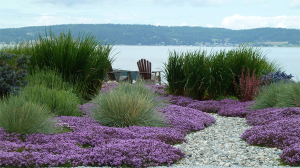 Градина, която се е превърнала в атракция в района заради нестандартното озеленяване. Пътека от камъчета води до водата и е заобиколена от високи треви и лилави цветя.