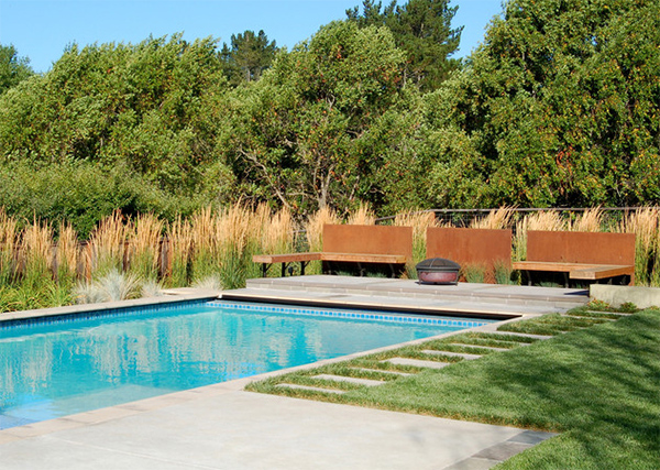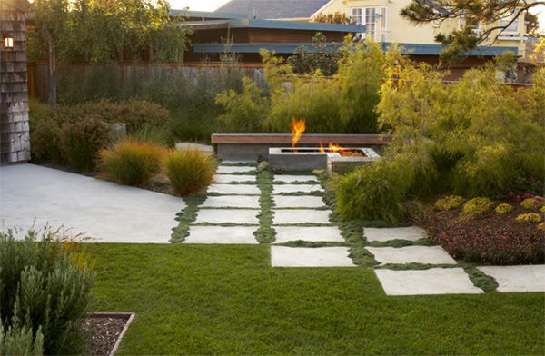 Излятите камъни и ниската трева изглеждат чудесно заедно, особено с огнището отстрани.