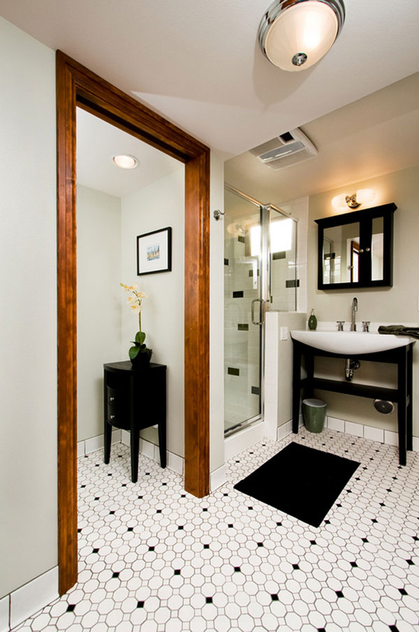 Един много остроумен дизайн на под за баня. Въпреки, че интериора е в неутрална цветова гама, подът придава забавна нотка.