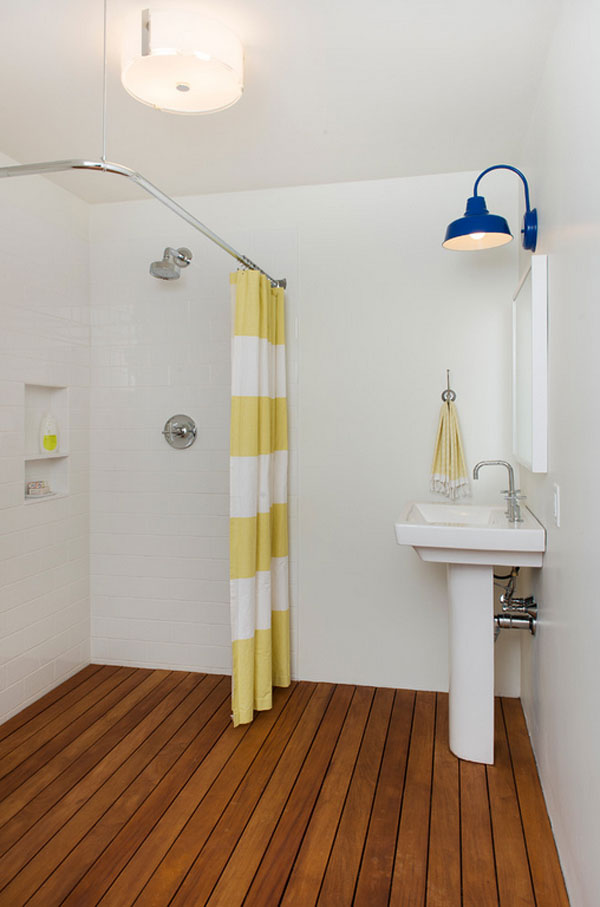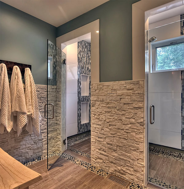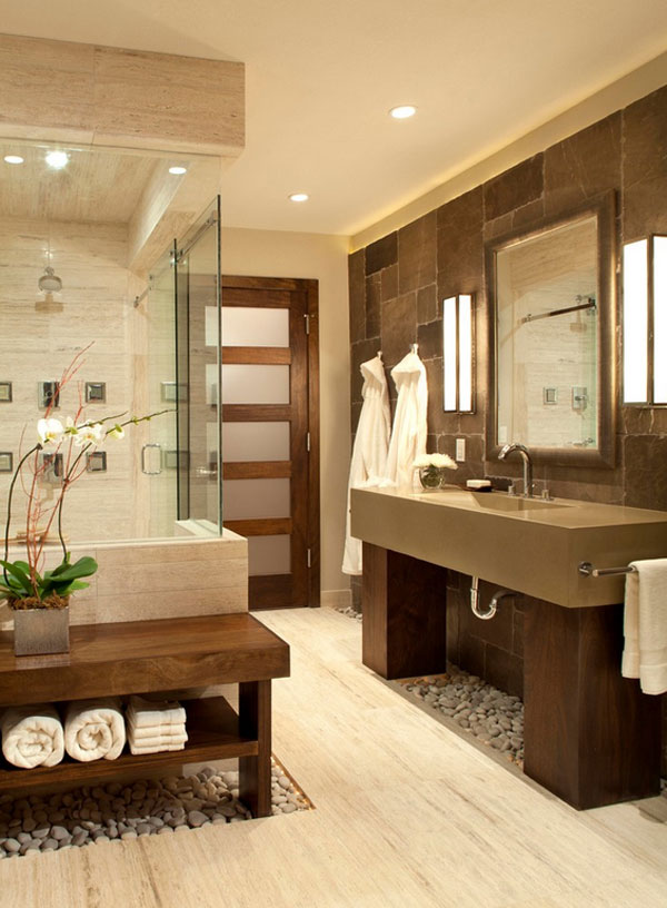 Камъни покрити с дървени плоскости е перфектната комбинация за подова настилка на банята.