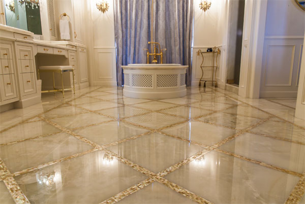 Забележете тази луксозна баня, чийто изящество и блясък са подчертани от употребата на камък оникс за пода!