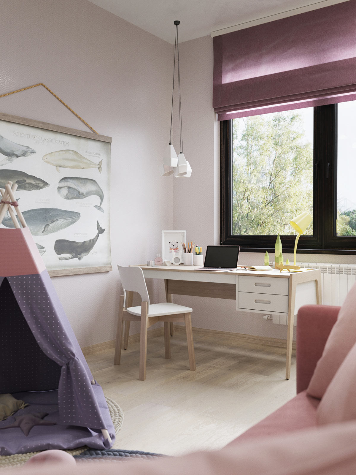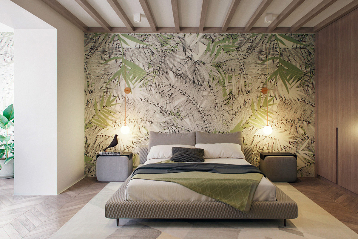 Характеристиките на естествения дървен материал придават малко рустик усещане на иначе модерното пространство. Детската стая стилумира творчеството на всеки, който влиза в стаята, а уникалната лампа за маса добавя цвят. За родителската стая темата се извисява към тропика. Стена с листа като акцента осигурява перфектния фон.