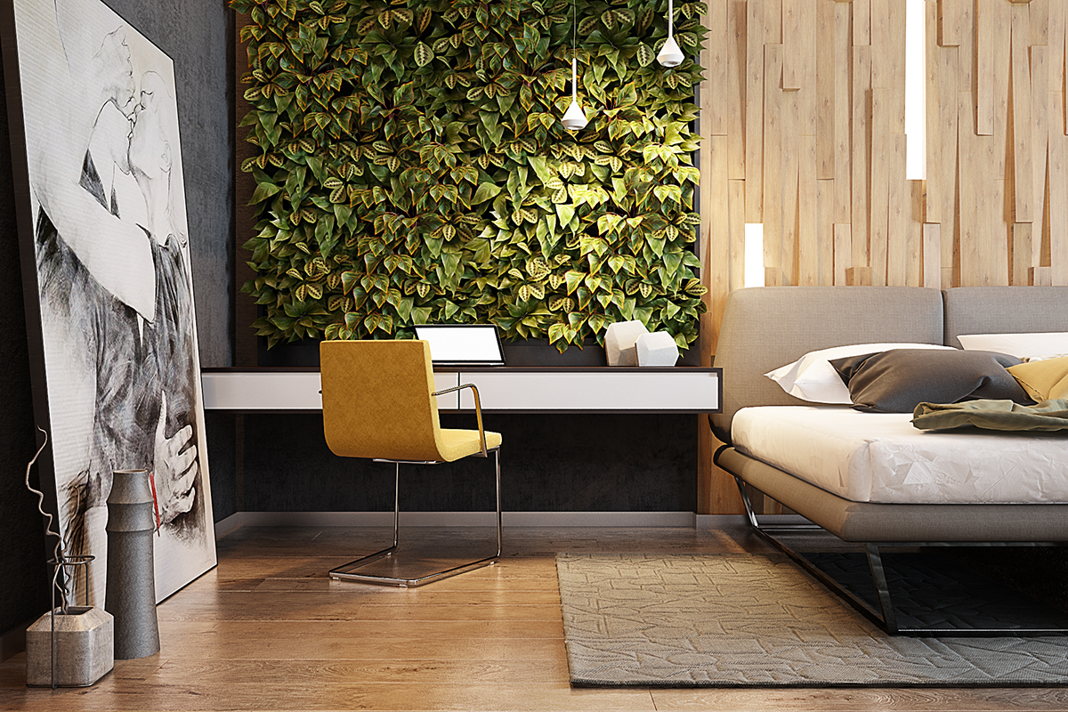Първата спалня използва екологичната тематика, контрастирайки с перфектния съвременен стил.