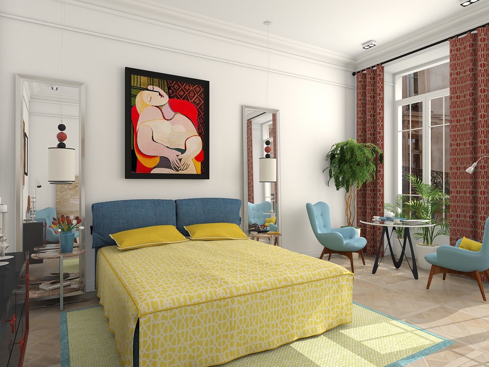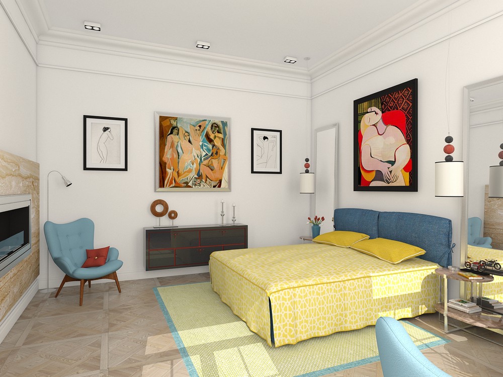 Още едно интересно и провокативно предложение – този дизайн на спалня е подходящ за млада двойка. Еклектично и съчетаващо бурна цветова гама, инспирирано от репродукции на Пикасо, то придава жив и възбуждащ стил на това пространство.