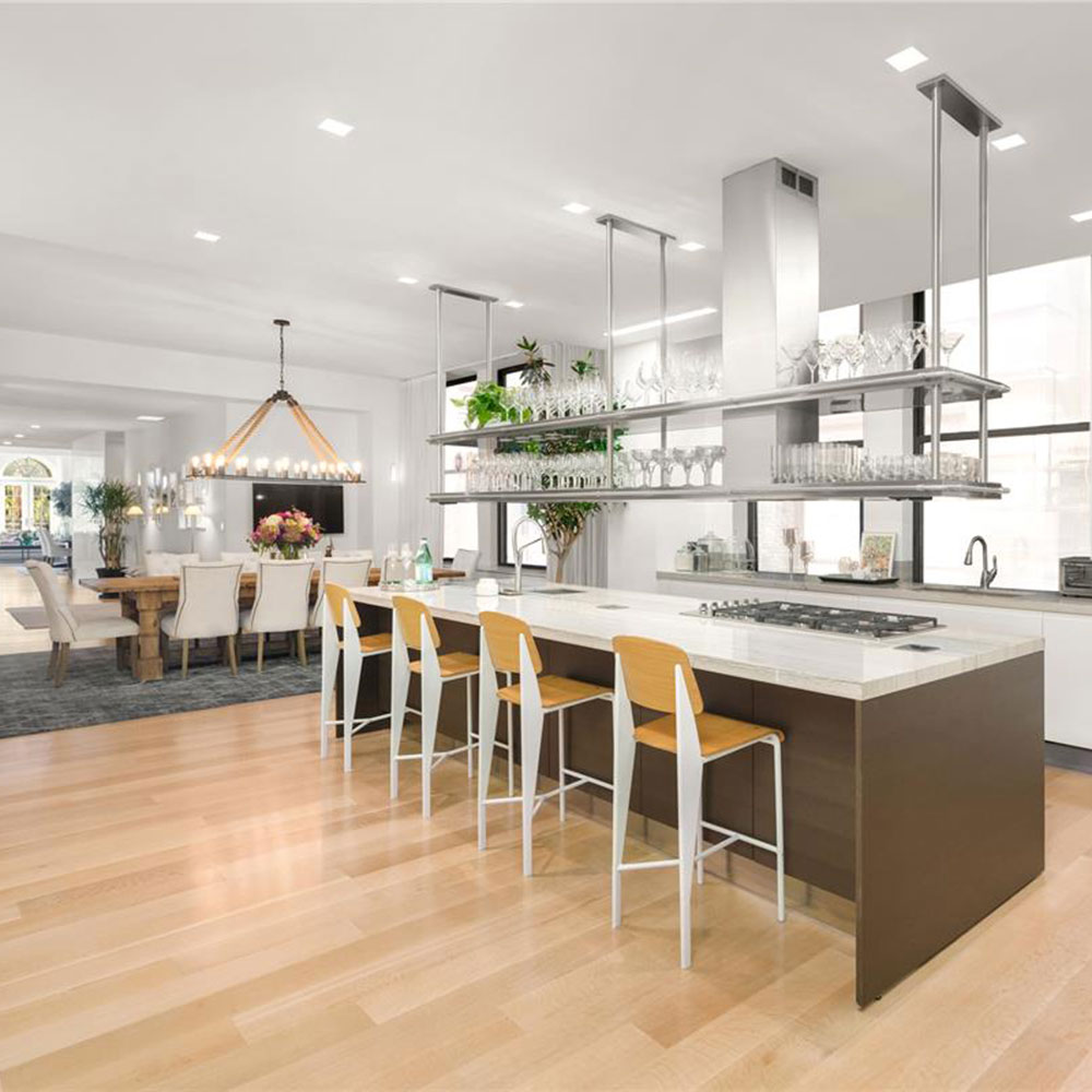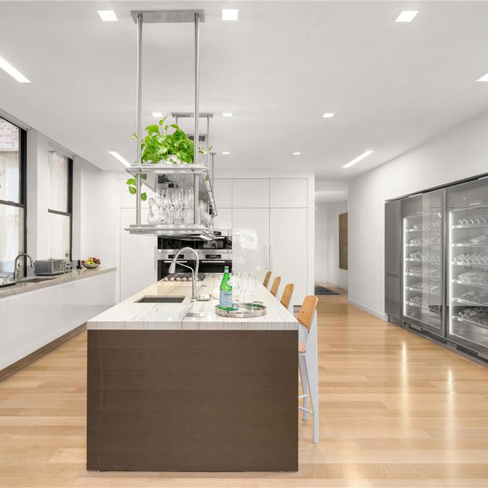 долара. Изтънчено и семпло с модерна италианска кухня, притежаваща последните иновации в кухненското оборудване и няколко високотехнологични хладилника. Страшно ни допада висящият рафт за чаши над кухненският остров, а това е една внушителна колекция чаши.