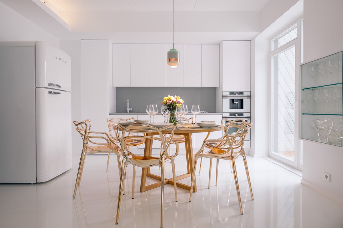 завършва с кухненския кът. Изцяло бялата кухня, държи в прегръдките си