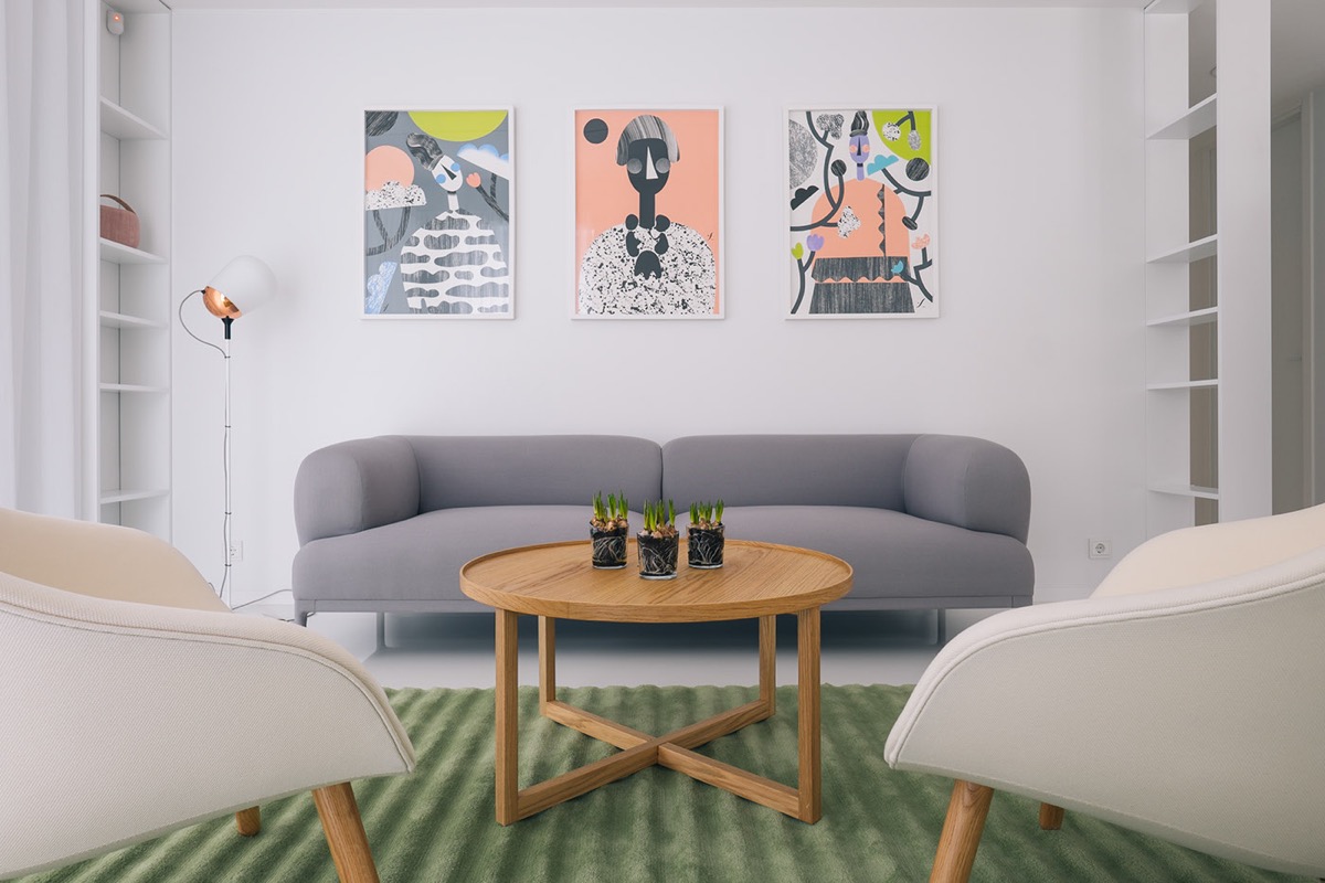 Първият разлив на цветове ни посреща на стената над самия диван и