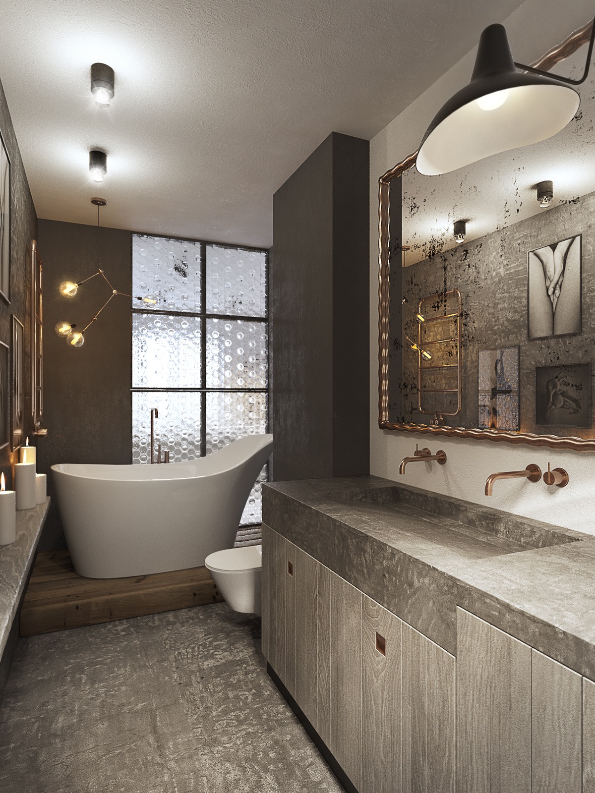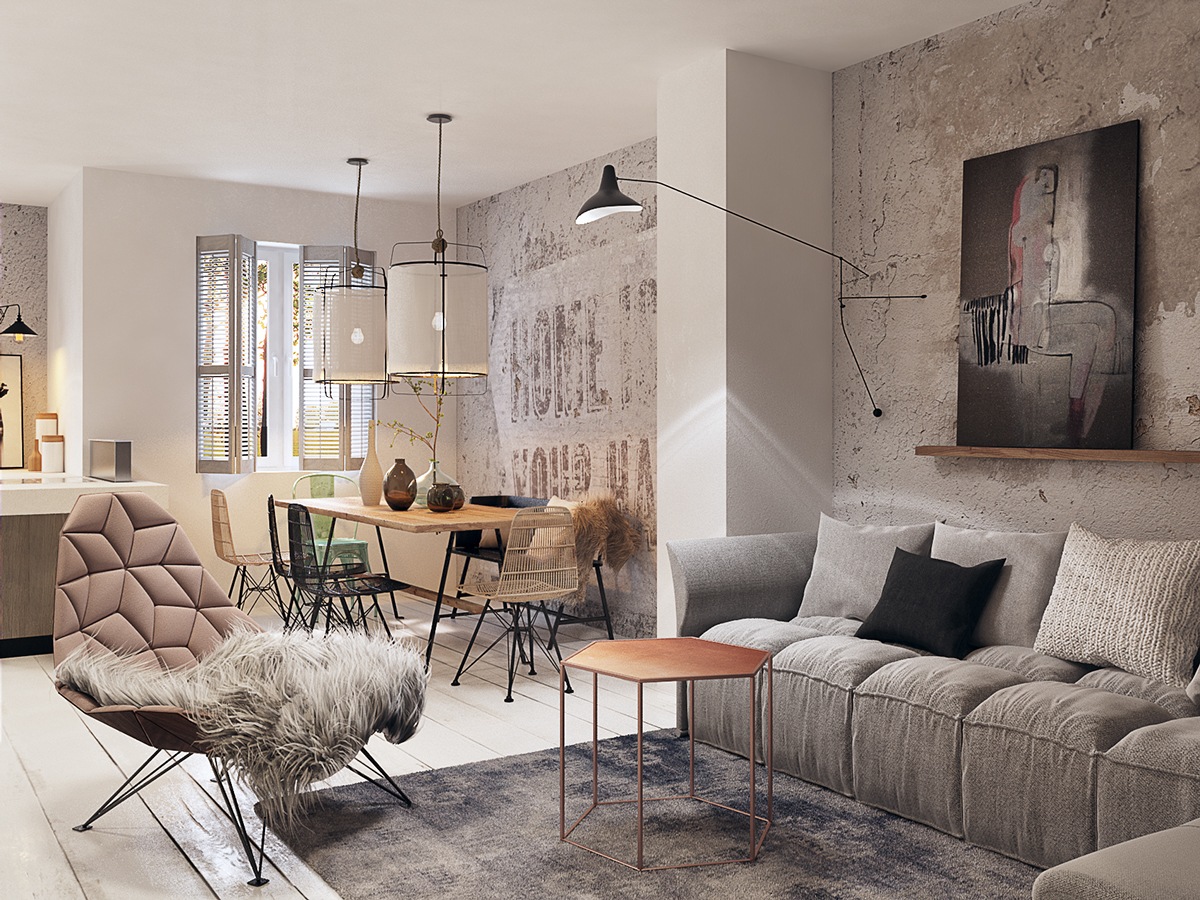 Бетонът е грубоват, в матиран цвят. Асоциацията: недовършена сграда. Но като част от промишления индустриален стил в интериорния дизайн, бетонът е модерен елемент и става все по-стилен. Студиото апартаментите, включени в галерията, използват бетон, за да се създаде шик, градски и недовършен грубоват вид, като изобщо не е незавършен.