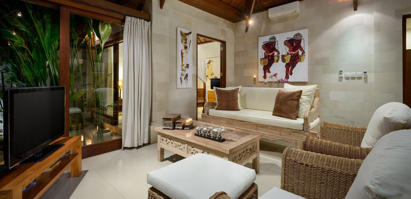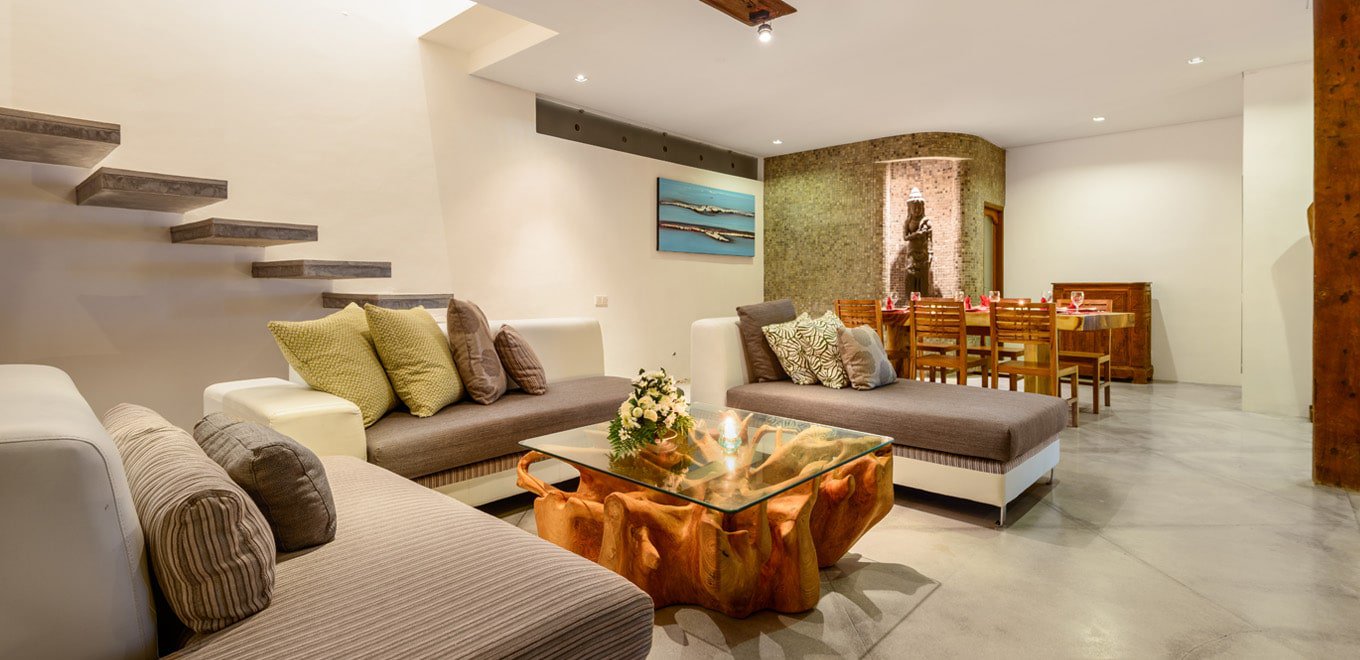 Големи стъклени врати са вход към стилната всекидневна, където можете да се скриете от лятната жега, благодарение на модерната климатична инсталация. Вниманието ви е задължително привлечено от ръчно изработената и гравирана маса в средата на помещeнието, а стъклените врати и прозорци разкриват гледка към богато раззеленената градина, която се превръща в част от декорацията на стаята. Уединената гостна е прелестно място за закуска с приятели или любимия. Храната може да се поднесе през стилния, но компактен бюфет, през който можете да надникнете в кухня в по-западен стил. Целият замисъл на тази вила, с отворените пространства и големи, свободни подове създават невероятно усещане за простор и са отлична основа за стилния ѝ интериор.
