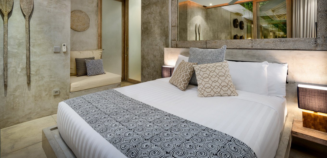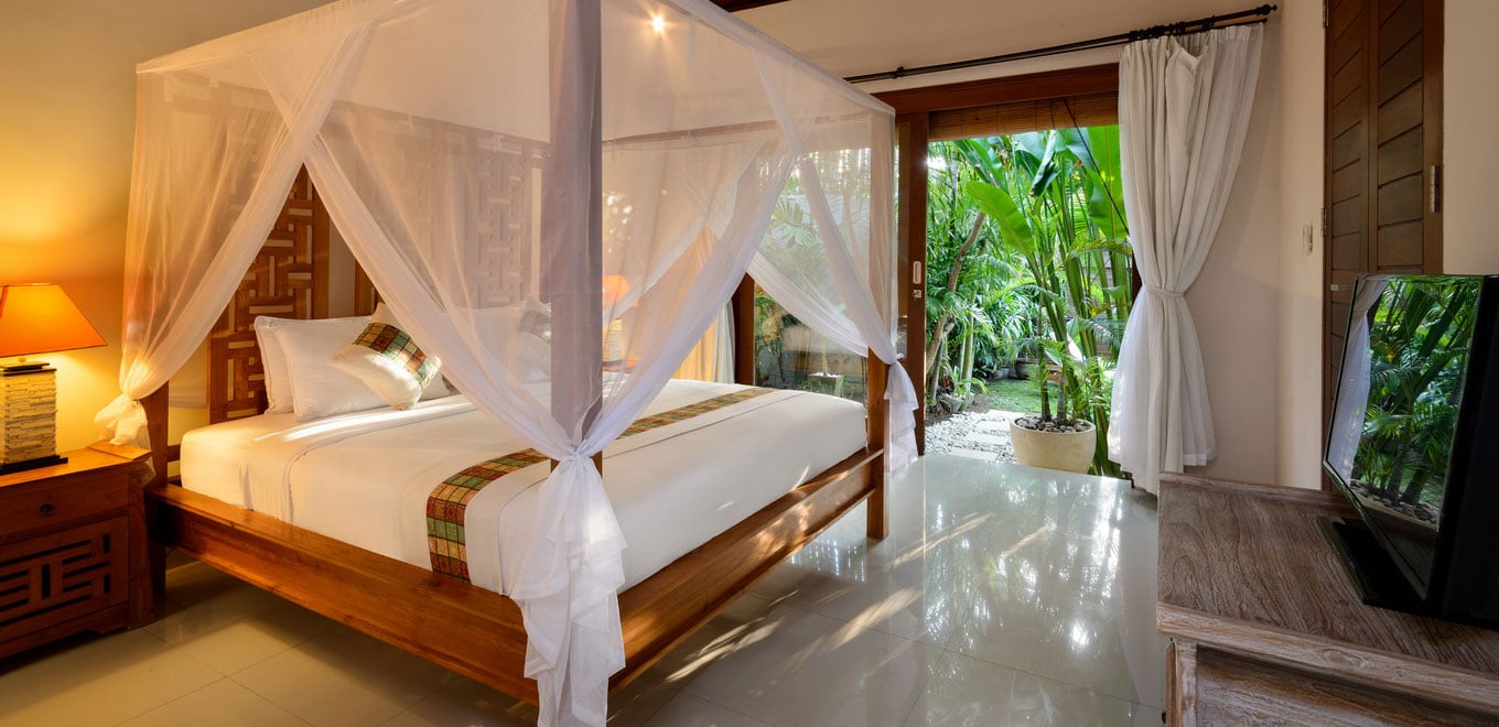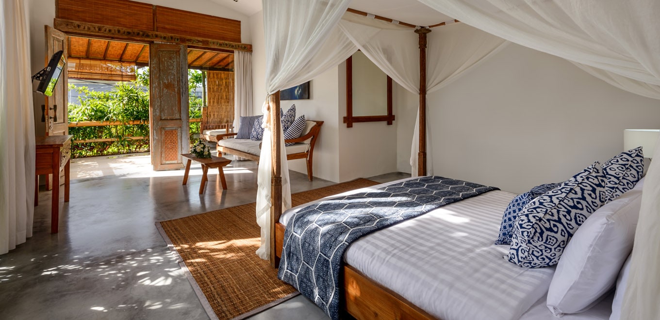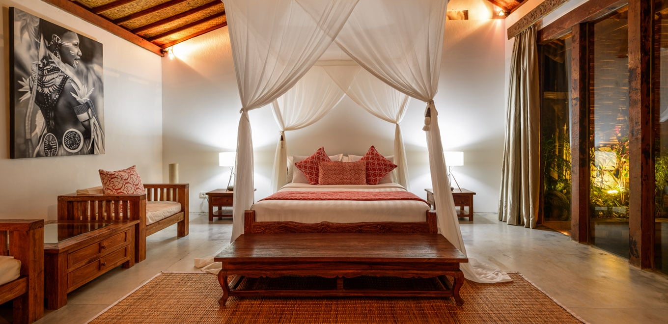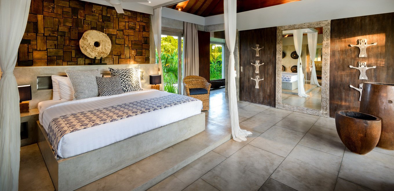 Основната спалня с легло в кралски размер е перфектното място за релаксация след ден под балийското слънце. Белият лъскав под отразява проблясъците слънце, проникващи през гъстата растителност, затопляйки цялата стая. Цветни десени и дървена мебел внасят топлина в издържаната в бяло стая, а тъмният дървен покрив контрастира отлично и има отличен декоративен ефект.