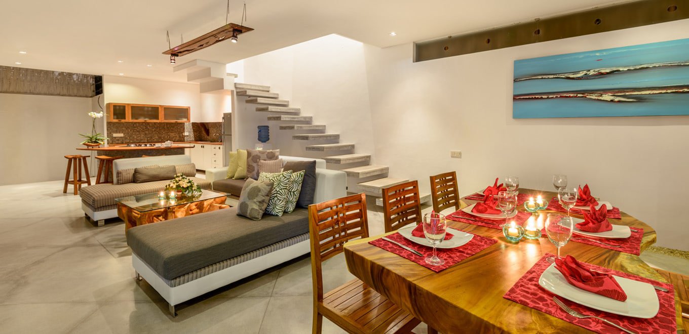 Красивите флорални елементи, разчупват пространството по мек начин, като внасят нотка тропическо усещане. Внимателният набор стилни и минималистични аксесоари насищат пространството с необходимият лукс. Основният акцент в интериорните решения на една балийска вила е несъмнено симбиозата между модерни архитектурни решения, функционалност и величествената природа. Всичко това е своеобразно пътешествие за сетивата в уютния тропически унес на острова.