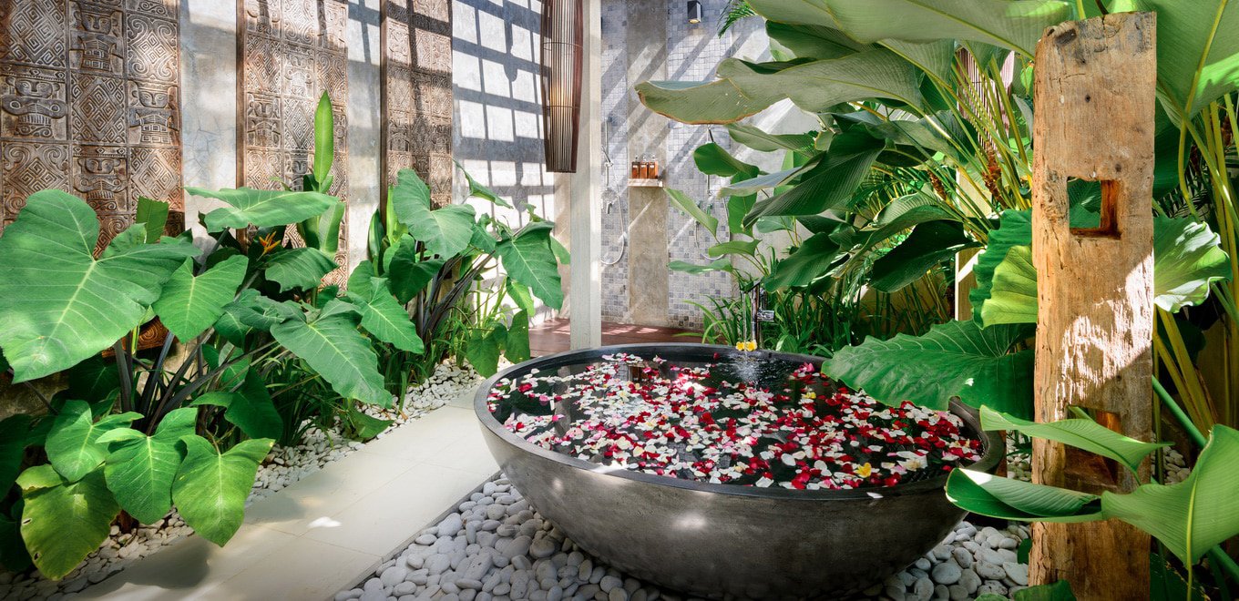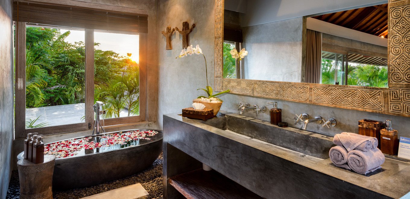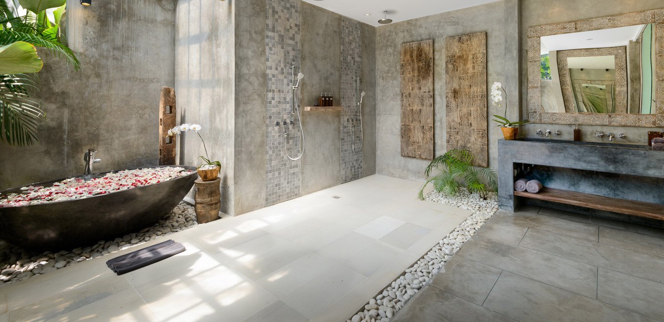 Баните във вилата са проектирани така, че да ви доставят изцяло тропическо изживяване. Те са безупречно декорирани и отразяват невероятната балийска природа, всъщност не се разделяте с пулса на острова нито за миг. Банята изглежда сякаш се къпете в дълечната джунгла, ефирността на простора в съчетание с уединението, което всяка баня трябва да предлага.