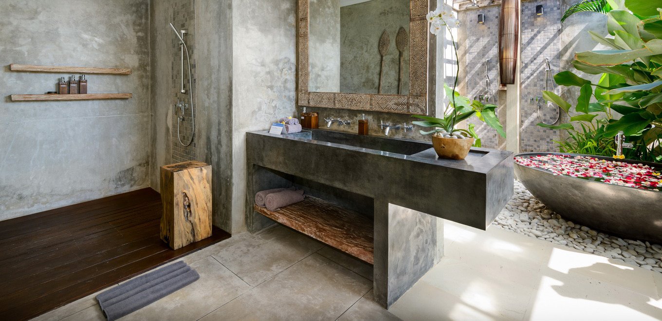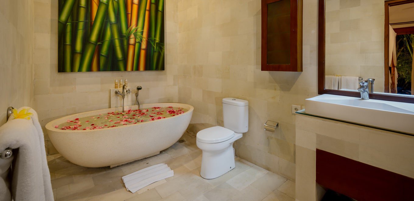 Баните във вилата са проектирани така, че да ви доставят изцяло тропическо изживяване. Те са безупречно декорирани и отразяват невероятната балийска природа, всъщност не се разделяте с пулса на острова нито за миг. Банята изглежда сякаш се къпете в дълечната джунгла, ефирността на простора в съчетание с уединението, което всяка баня трябва да предлага.