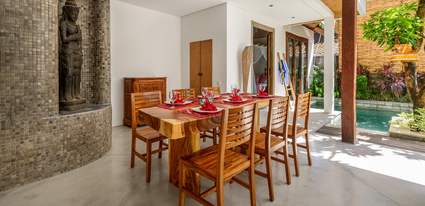 Красивите флорални елементи, разчупват пространството по мек начин, като внасят нотка тропическо усещане. Внимателният набор стилни и минималистични аксесоари насищат пространството с необходимият лукс. Основният акцент в интериорните решения на една балийска вила е несъмнено симбиозата между модерни архитектурни решения, функционалност и величествената природа. Всичко това е своеобразно пътешествие за сетивата в уютния тропически унес на острова.