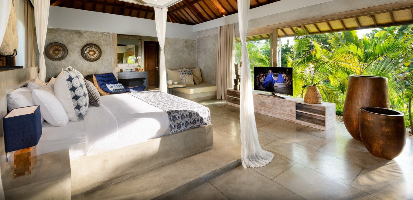 Основната спалня с легло в кралски размер е перфектното място за релаксация след ден под балийското слънце. Белият лъскав под отразява проблясъците слънце, проникващи през гъстата растителност, затопляйки цялата стая. Цветни десени и дървена мебел внасят топлина в издържаната в бяло стая, а тъмният дървен покрив контрастира отлично и има отличен декоративен ефект.
