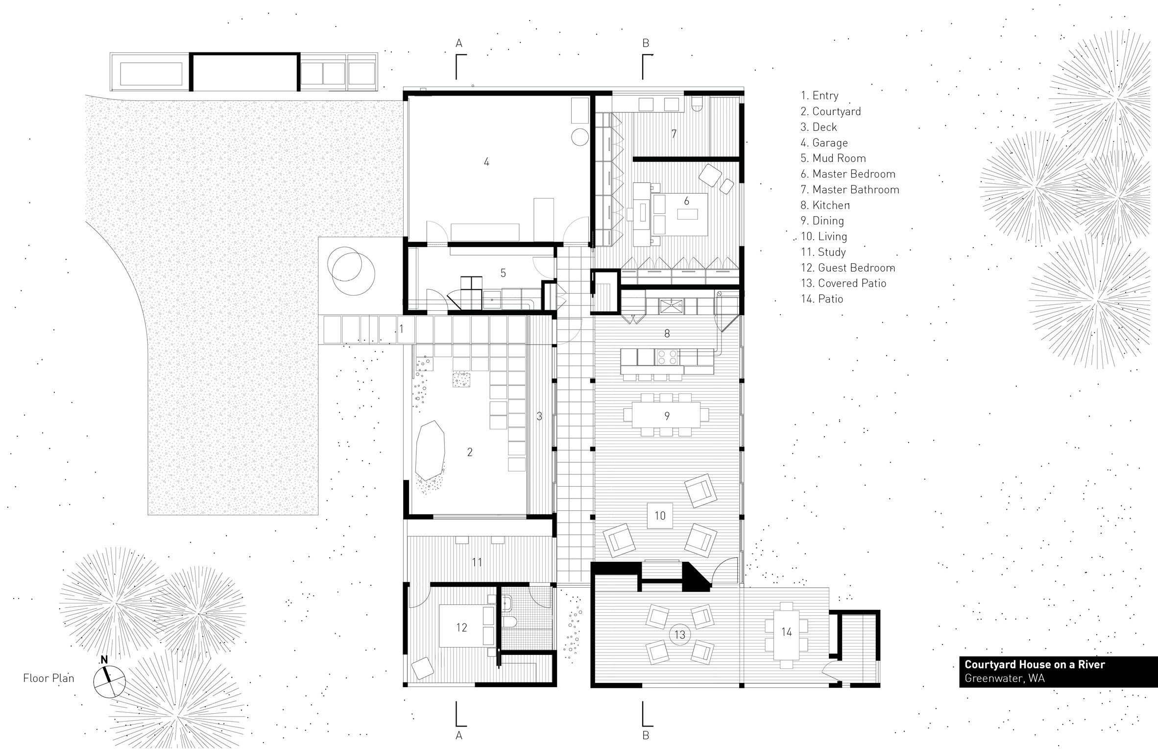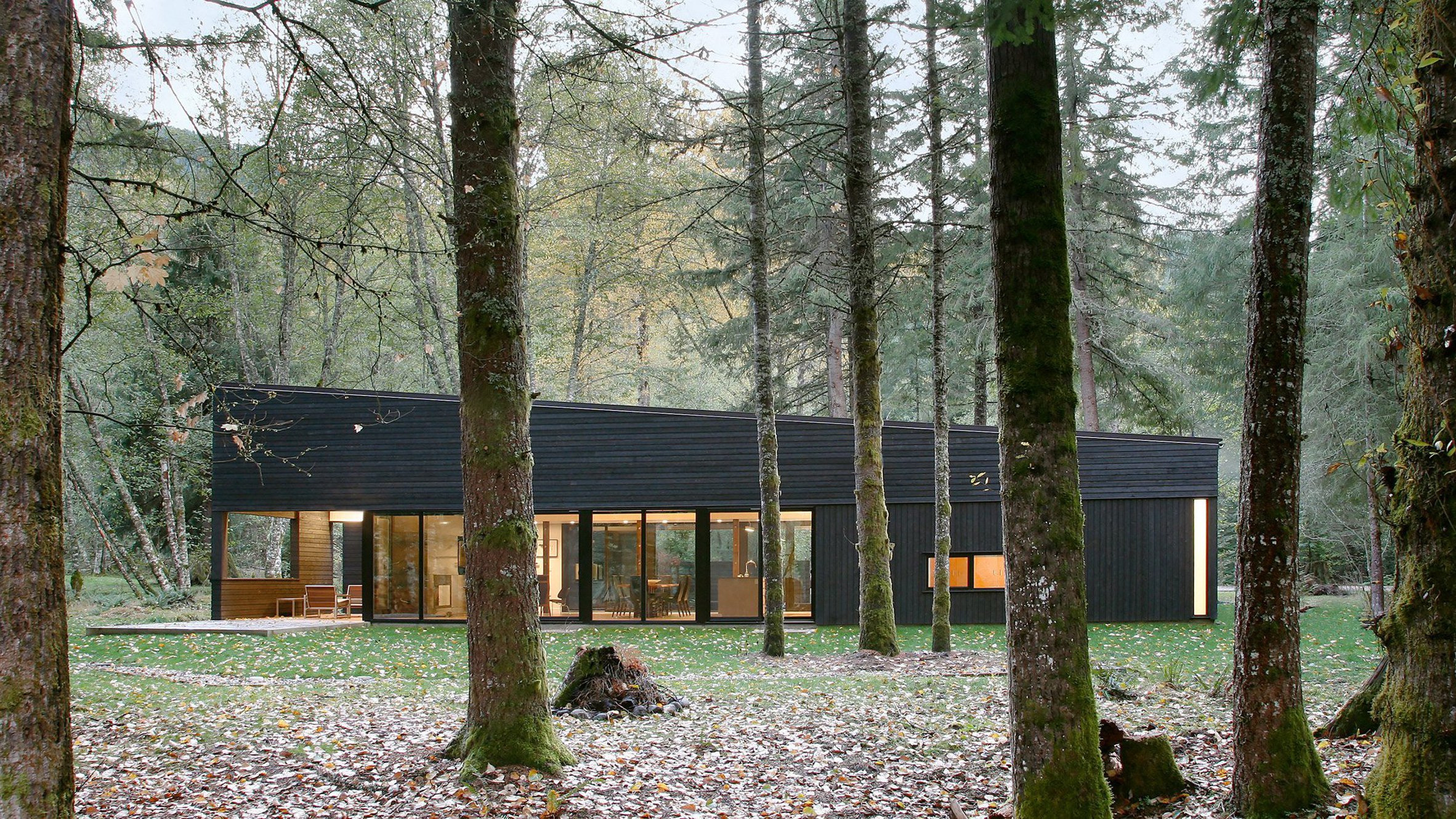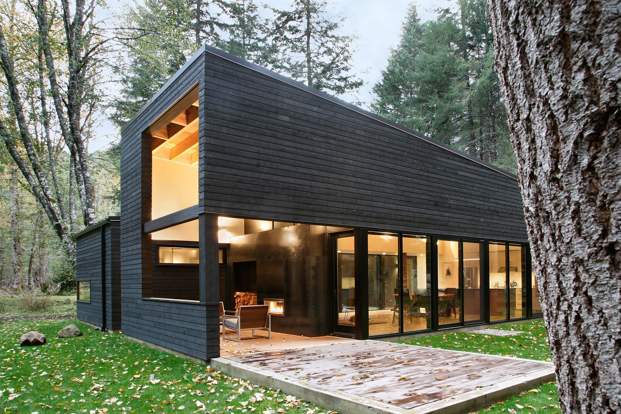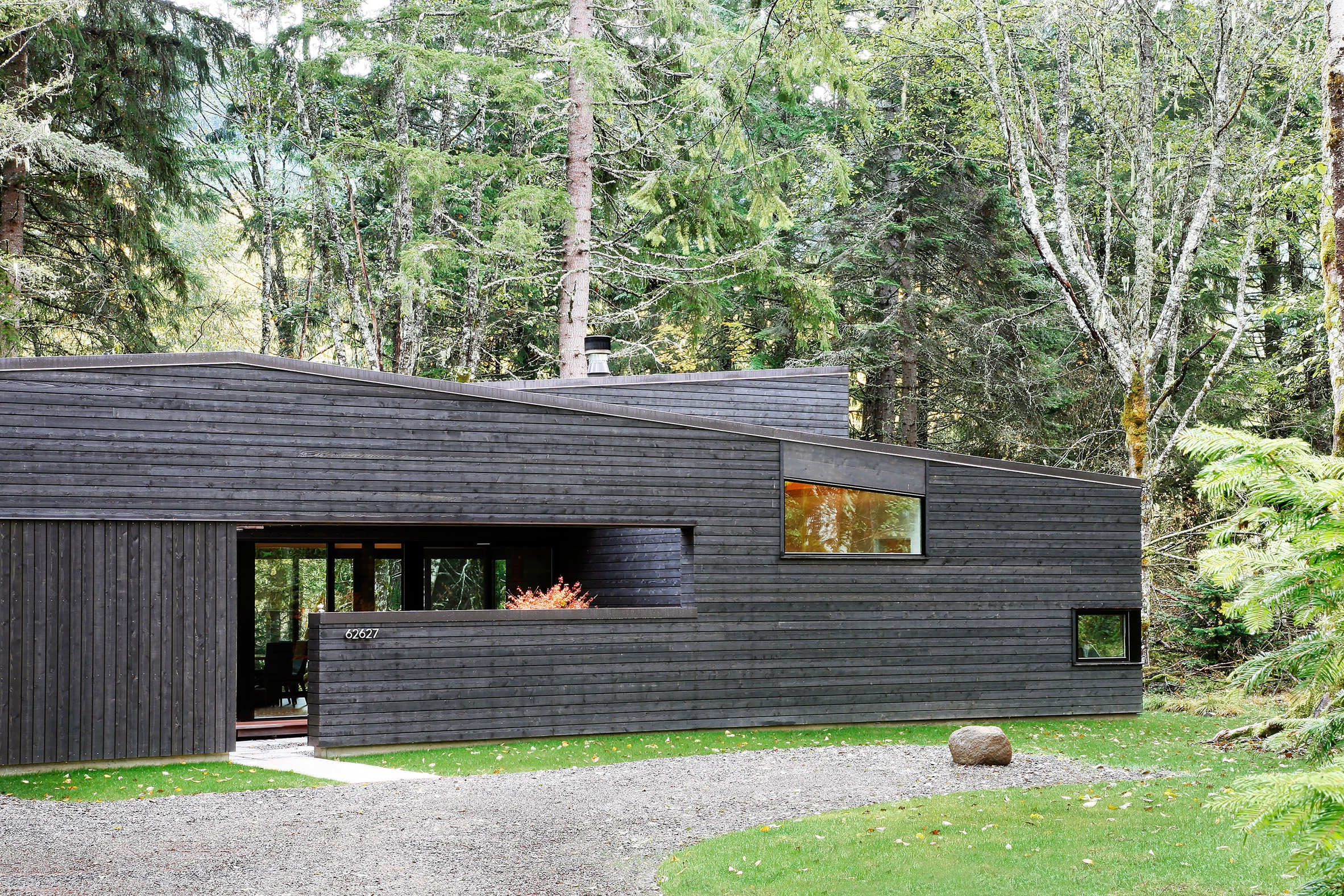 Тази черна дървена къща се намира в покрайнините на Сиатъл и е разположена в чакълест двор, който позволява на собствениците си да се усамотят, но и ги защитава от скитащи лосове. Имотът, наречен „къщата с двор на реката“, се намира във вечнозелената гора по протежението на бреговете на река White river, които са част от специално проектиран резерват за лосове.