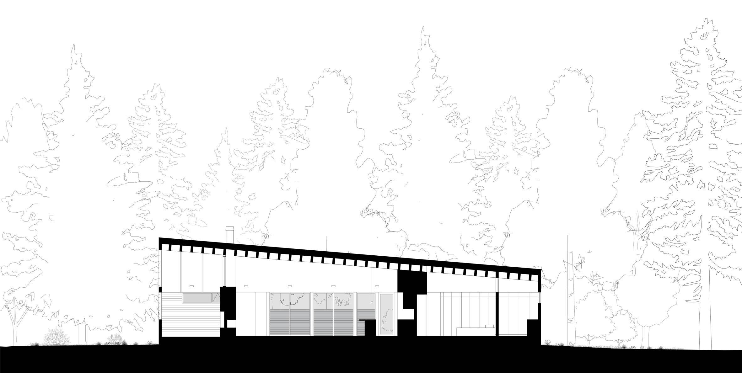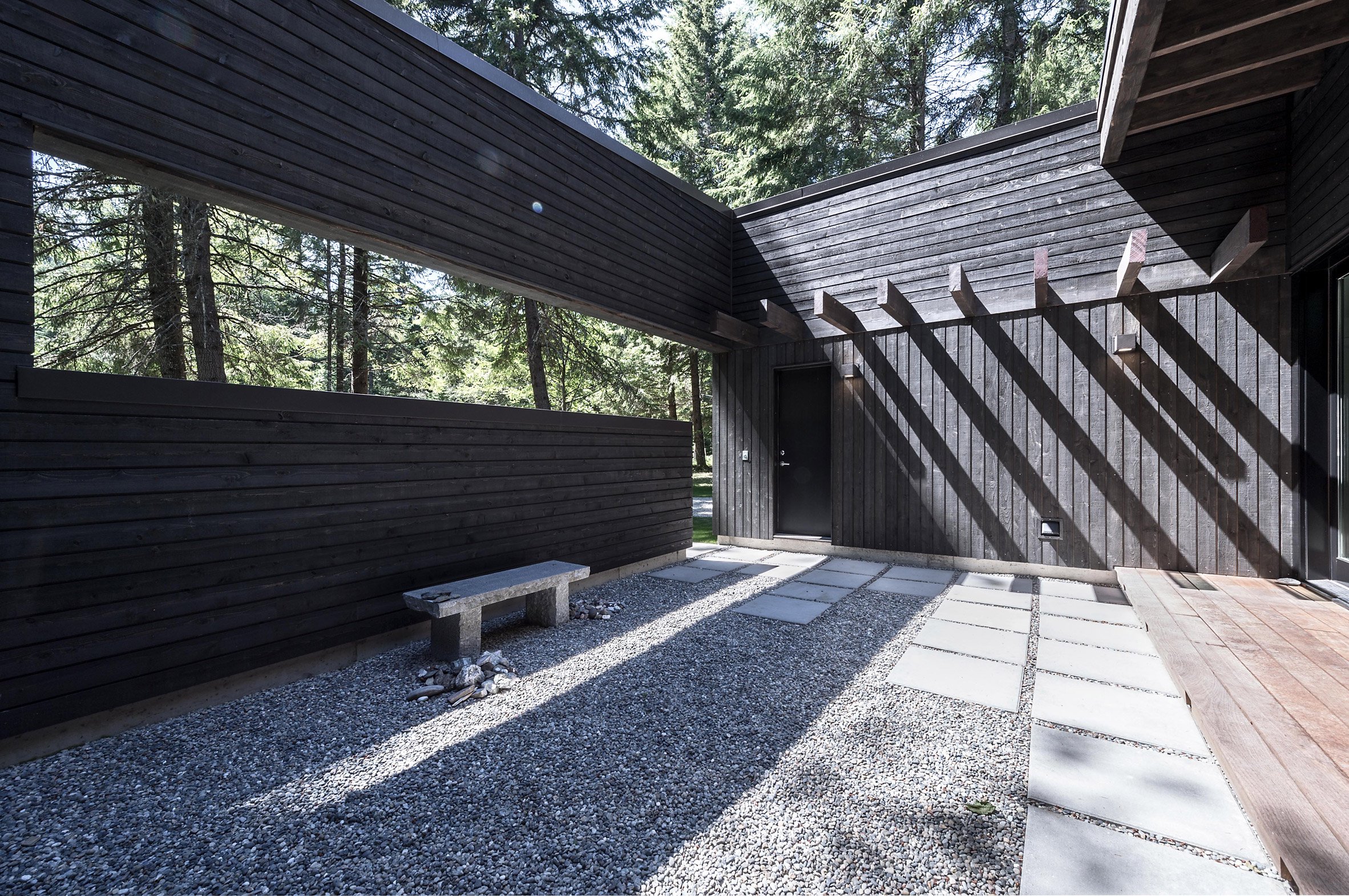 Местното дизайнерско студио Robert Hutchinson architecture проектирали едноетажната постройка компактно (тя е 177кв.м.) и с грижа към заобикалящата я природа. Външната облицовка на къщата е от западен червен кедър в черен байц, за да се слее с околните дървета. Някои дизайнери прибягват до дървесина в черно с цел да скрият хижа в гората – такива примери можем да открием в Уисконсин и Северна Каролина. Другата цел е клиентът, който в този случай е и главен архитект на къщата, да се сдобие с дзен скривалище от забързания живот. За целта, екипът изгражда структура подобна на двор от черно дърво. Вътрешността на дървеният двор се състои от подова настилка от калдъръм и чакъл, каменна пейка и гледка към върховете на дърветата. Лицето на къщата е изцяло стъклено, за да пропуска максимално количество естествена светлина вътре, а дървената стена отвън държи на разстояние любопитните лосове.