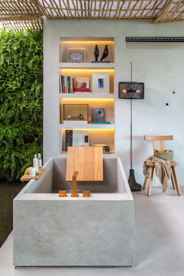 Тоалетната е отделена от тежки завеси окачени на кръгла метална рамка. Освен нея, в банята има две мивки с модерна форма и минималистична мраморна вана. Интериора на банята е много нестандартен. На стената има издълбани рафтове с вградено осветление, което омекотява декора. А в ъгъла ще намерите стол Inout, превърнат в своеобразен очарователен акцент.