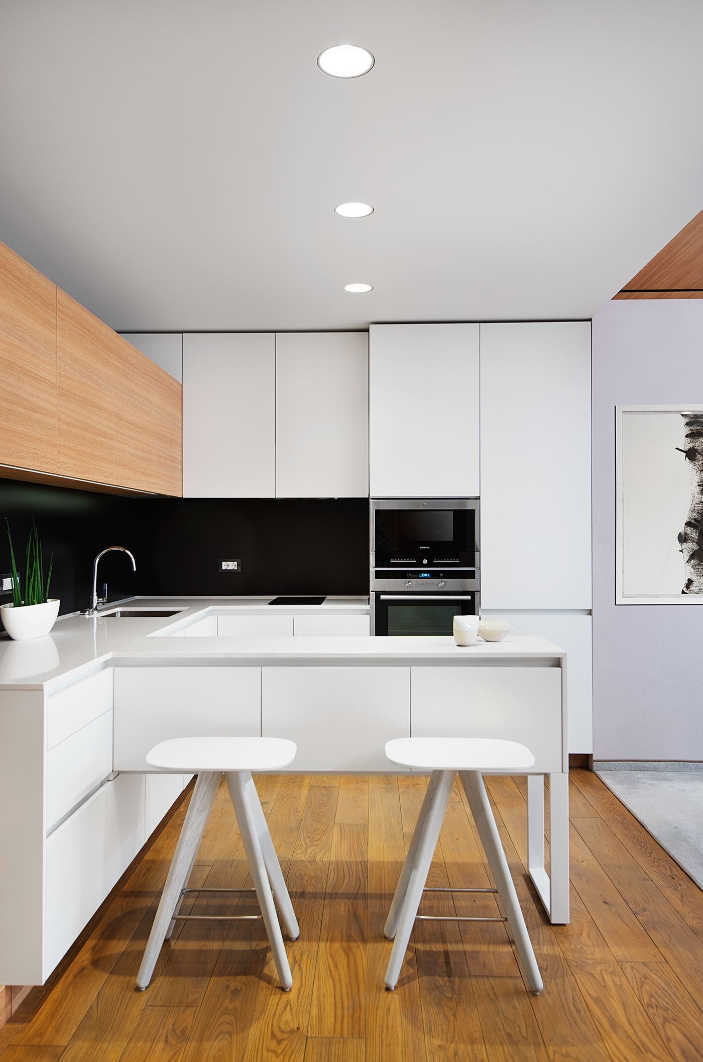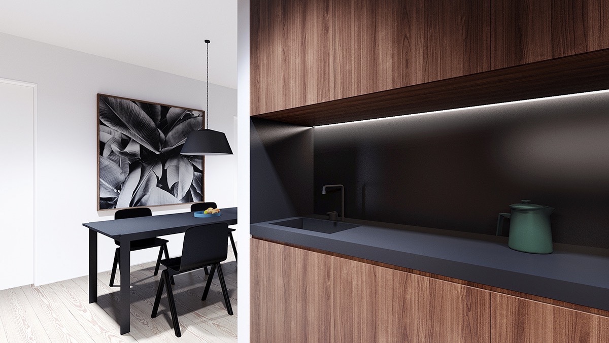 Белите работни пространства поддържат чист и гладък естетически идеал за кухнята, докато при подовете и шкафове се въвежда отново съществен класически елемент. Матовите черни плотове за гърба в кухнята са необичаен избор. Благодарение на дървесината и интелигентното използване на цветни акценти, интериора се чувства жив и динамичен, въпреки, че леко клони към минималистичната страна на модернизма.