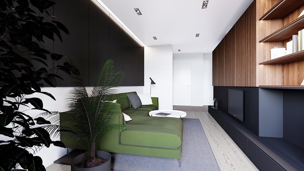 Този балансиран и симетричен дома заема скромните 80 квадратни метра, като при него е използван по-творчески подход, за да отвори на дизайна и оформлението. Разделението между стаи е напраено с помощта на една невероятна свободностояща за съхранение и медии стена, облечена в гладка дървесина в мек тон. Всяка страна предлага уникална функционалност.
