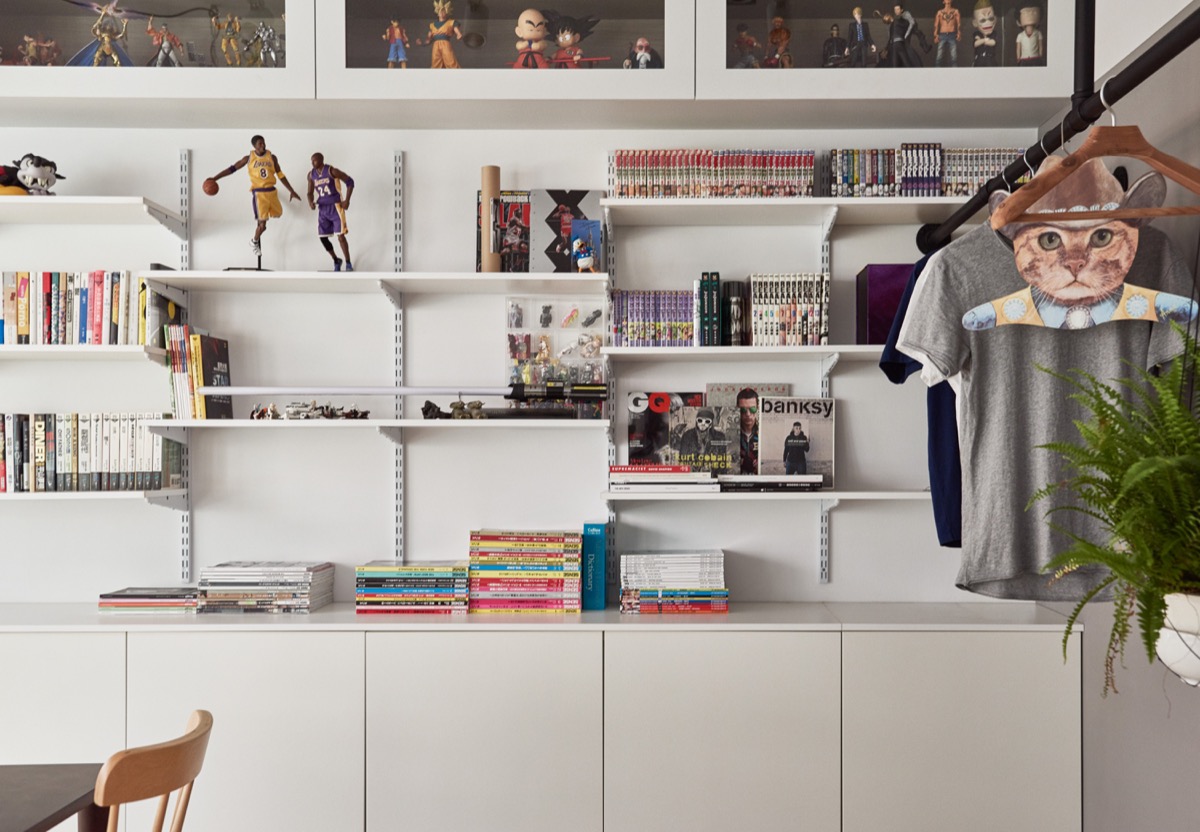 Цветовата схема е много лека, позовавайки се на контрастни акценти. Рафтовете са гениален начин за съхранение на вещи и то по естетичен начин. Разнообразие от книги и колекционерски играчки декорация в стаята отразяват личността на собственика, превръщайки рафтовете на стената в акцент.