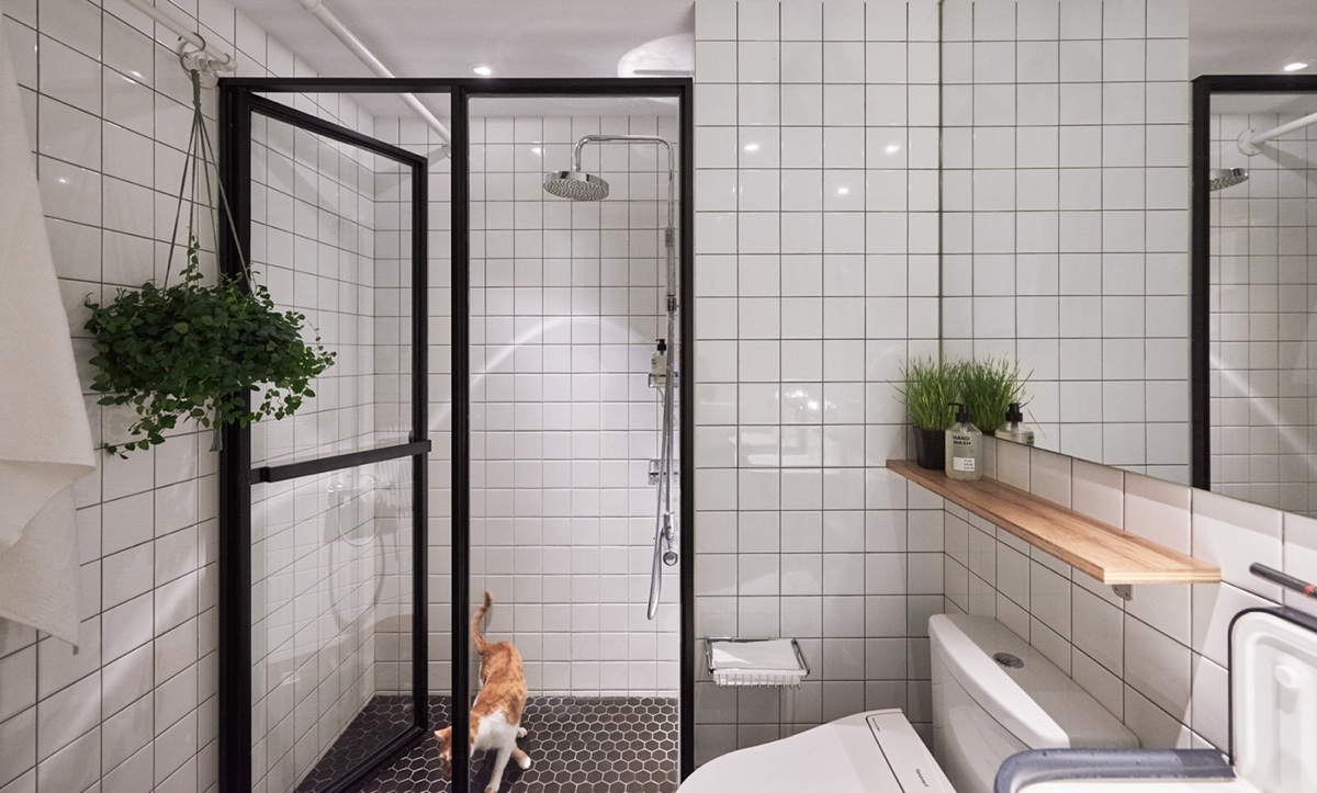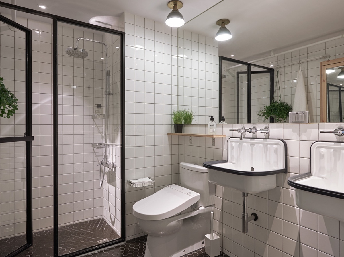 Семплите черни шестоъгълни плочки на пода добавя цвят в банята, и контрастират приятно с белите стени. А висящите растения и дървените рафтове добавят органична топлина на това, което би било иначе студена и безлична стая.