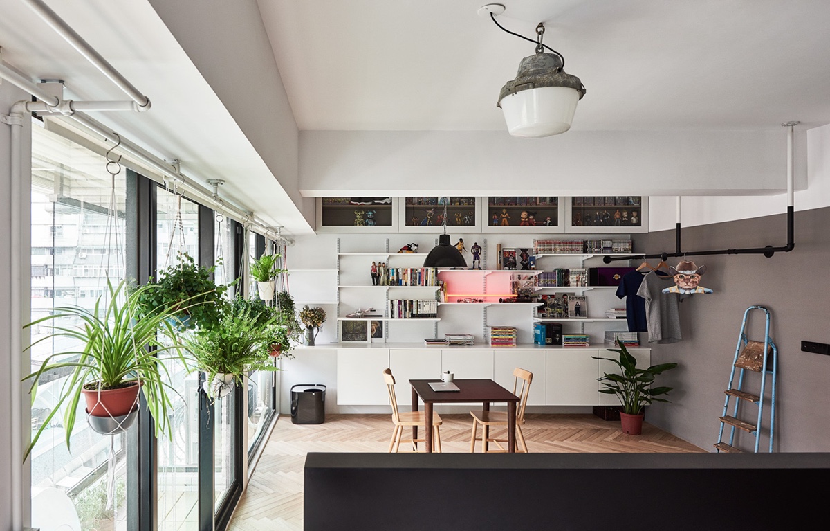ST Design Studio трансформира малкото пространство в едно лъскаво, функционален таванско помещение. Това таванско помещение в момента е отворено и интегрирано пространство, което се грижи за начина на живот на собствениците му. Осигуряване на светлина и органична красота срещу един градски фон, като се зачитат навиците и дейността на двете котки.