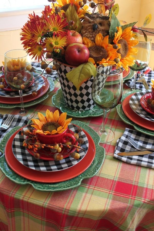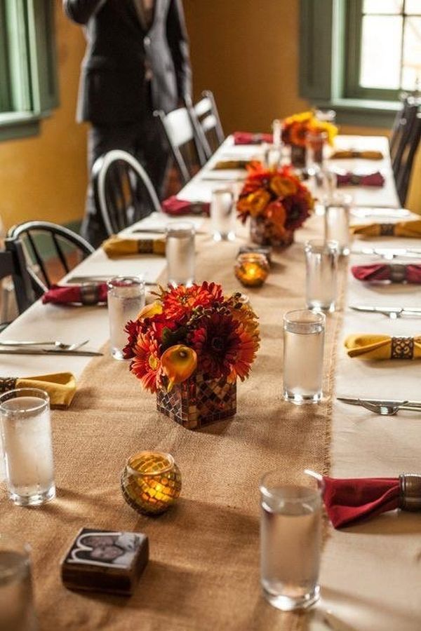 Както можете да видите, тези примери красиво използват цвета на есента и природните материали. Повечето от тях включват паднали листа, клони, тикви и борови шишарки. Има много символични елементи, които можете да използвате, когато декориране на масата. Достатъчно е просто да погледнете в градината и да намерите вдъхновение. Опитайте се да следват сезонната цветова палитра с нюанси като жълто, кафяво, червено и оранжево.