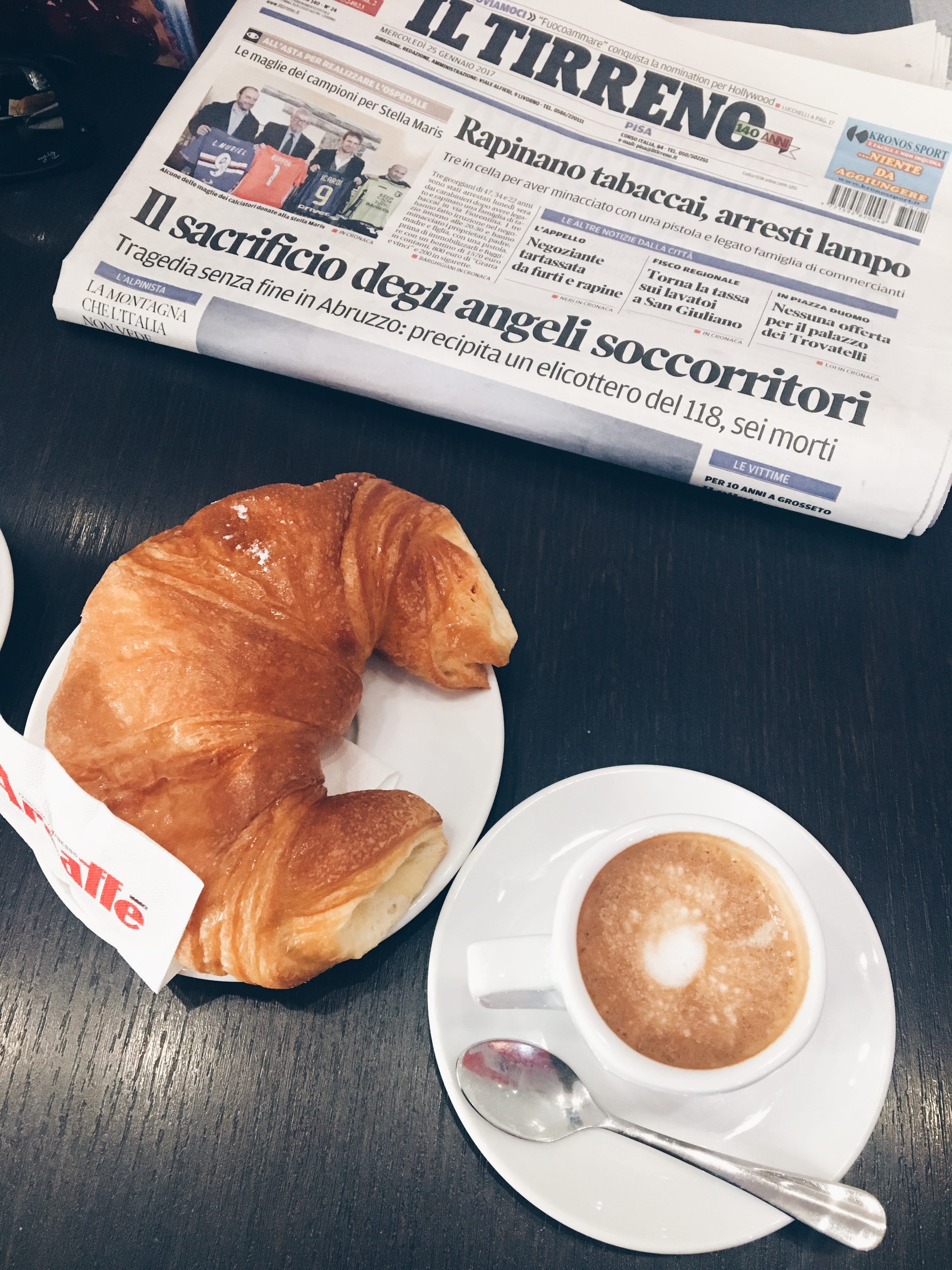 А първата утрин посреща по любим начин – с любимата напитка и любимите кроасани, очевидно обожава италианския начин на събуждане. Късо, силно и ароматно кафе с капчица мляко, те го изпиват на крак с чаша вода в едната ръка, ръкомахайки с другата.