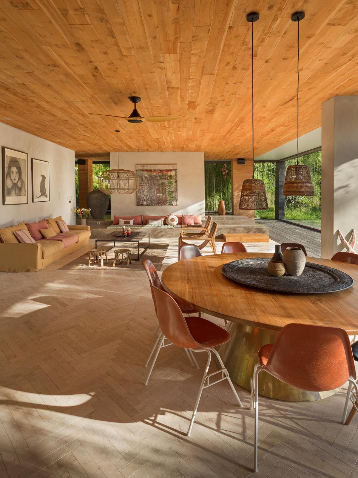 Вътрешността на къщата продължава натуралната схема отвън. Всичко е в топли цветове и дървесни тонове. Естественото дърво, което е избрано за почти всички повърхности вътре, прави пространството страшно уютно и топло, за онези вечери на закрито. Стълбите водещи навън, почти се сливат с интериора, правейки къщата още по-специална.
