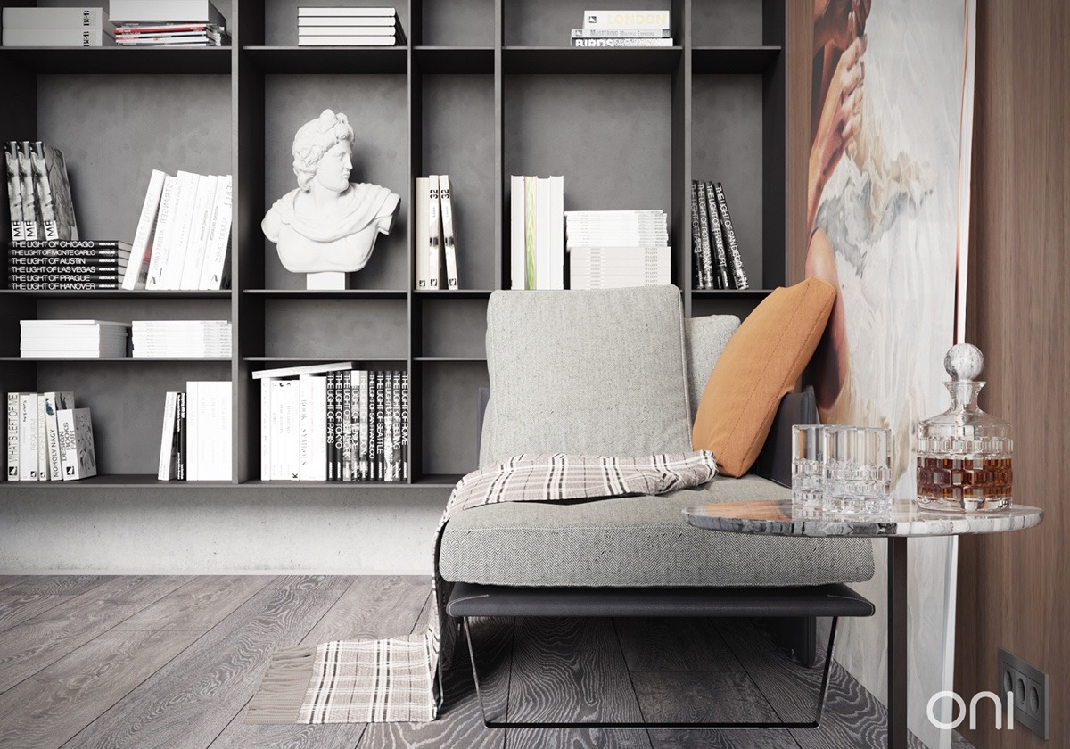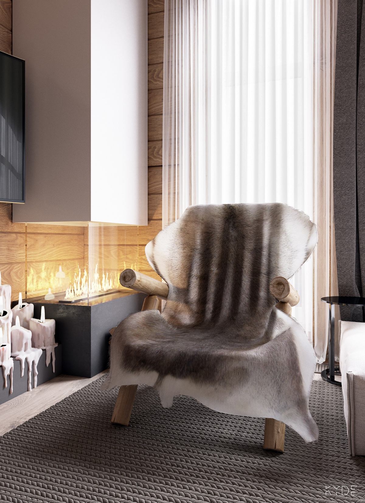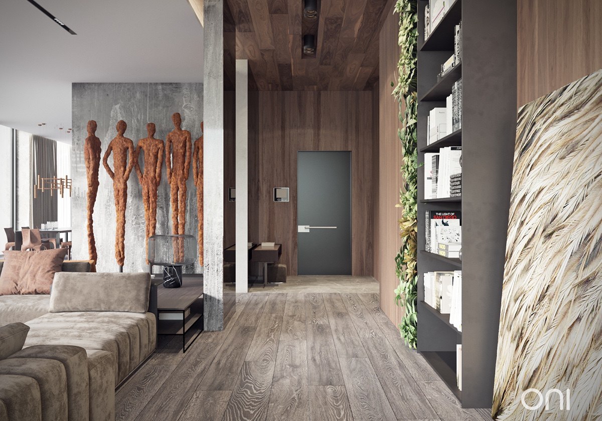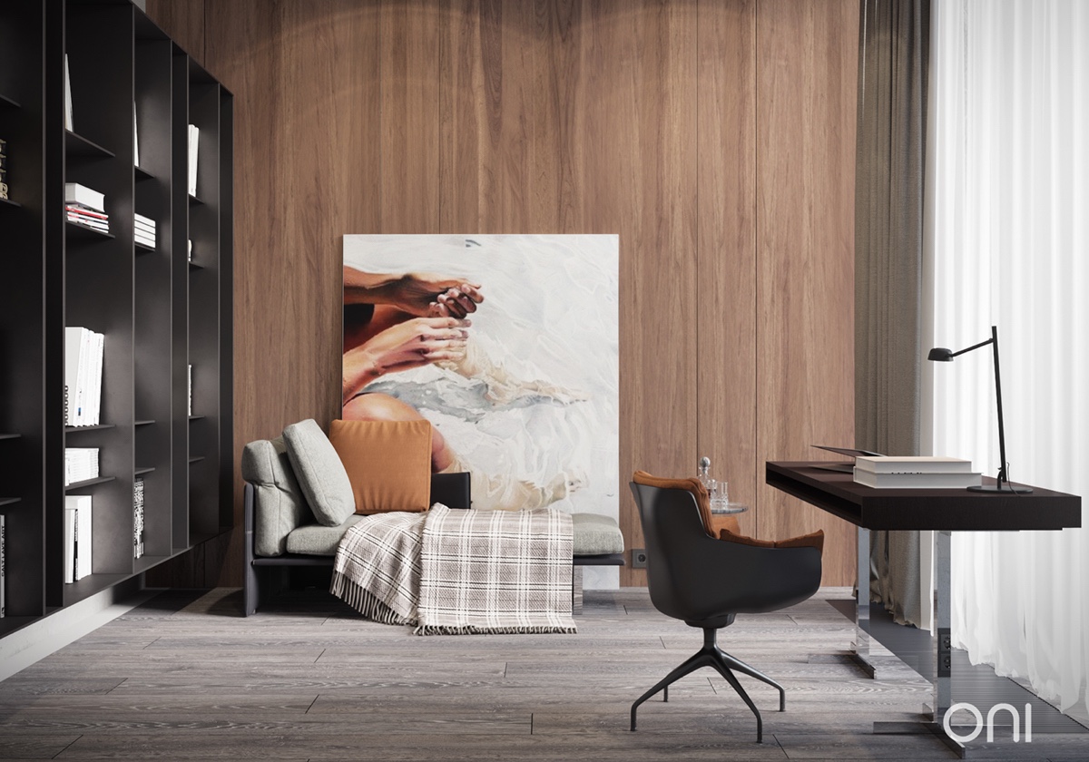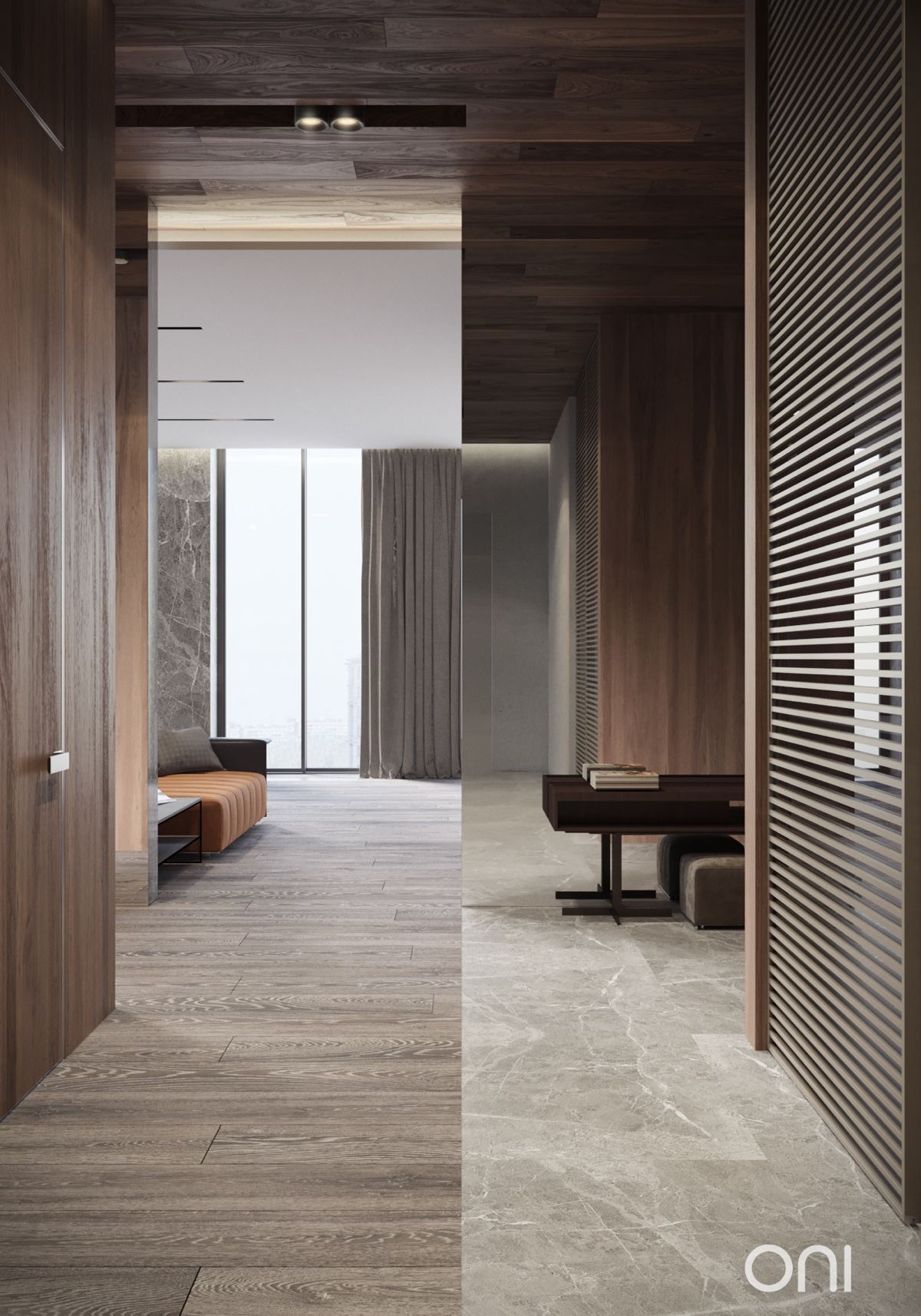 Вторият апартамент е с площ от 180 кв.м. и се намира в Москва. Тук също виждаме интериор решен в дърво, но усещането е много по-модерно и семпло, което е видимо най-вече в детайлите. Въпреки строгото усещане, тук лъха и на комфорт, за което допринасят дългите удобни дивани. Този кабинет, например е доста по-различен от клишето. Снабден е със специален кът за четене, който изглежда примамливо приветлив. Спалнята е голяма, а минималистичният интериор я прави изключително Дзен.