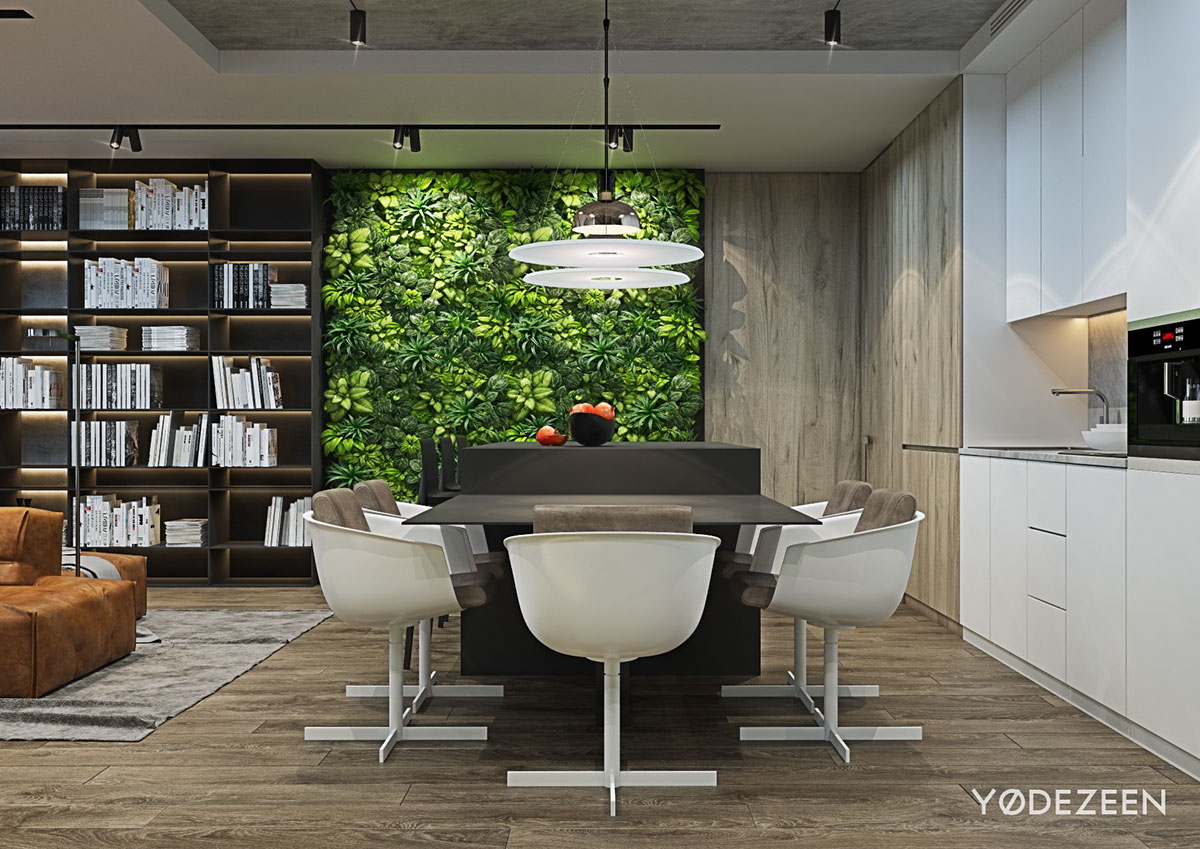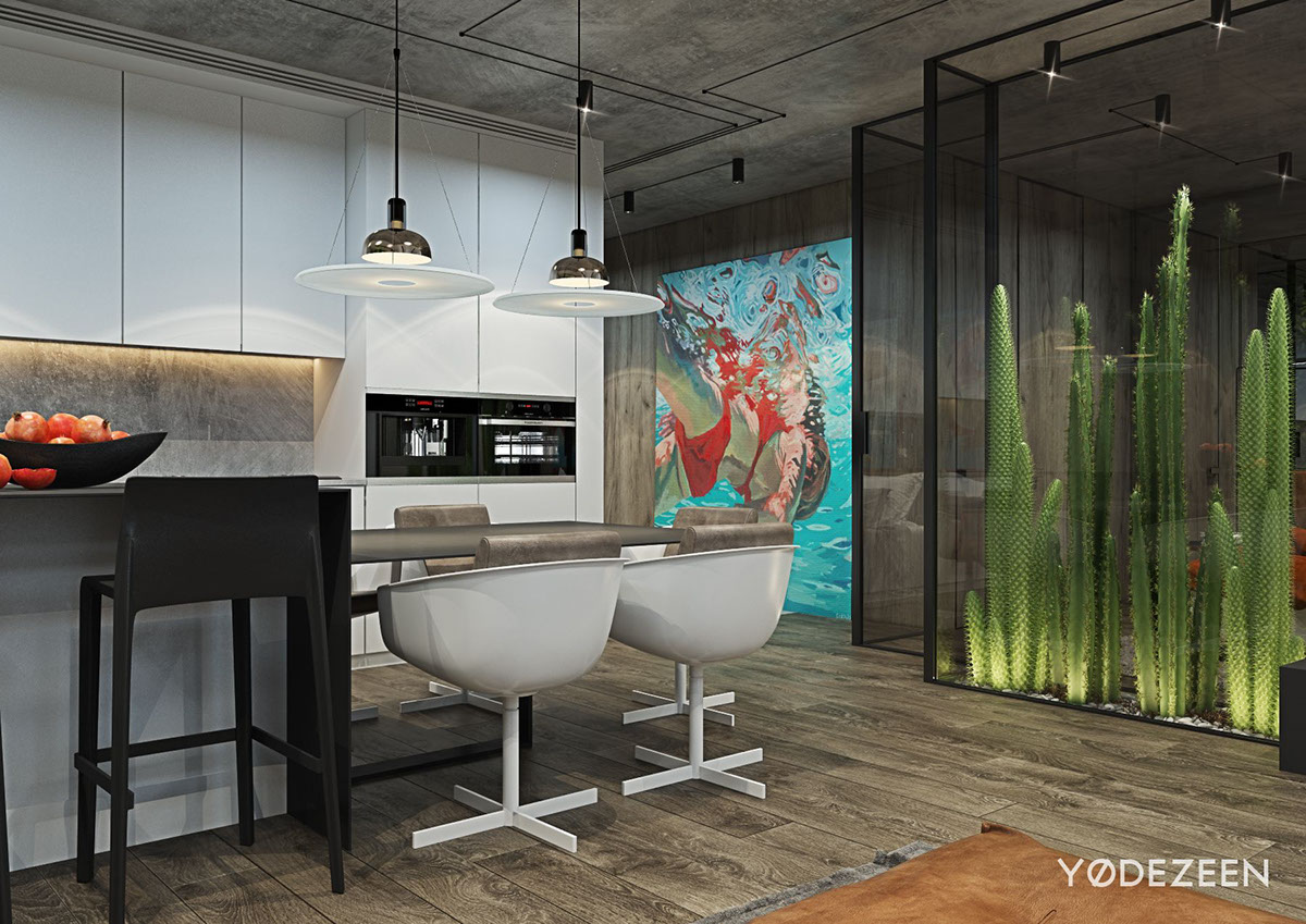 Първият апартамент създава миниатюрни гори от повдигнатите саксии и вертикални градини, а втория – обхваща приглушена пустинна тема, съсредоточена върху събирането на високи кактуси.