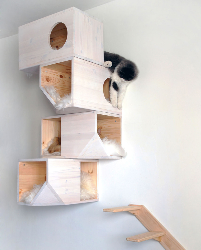 Котешката кула, която е прикачена към стената се предлага в редица цветове и включва: 4 модула, 4 възглавници от овча кожа и едно стълбище. Може да бъде поръчана онлайн и определено може спокойно да се каже, че се харесва от всички котки като ги кара да се чувстват наистина специални домашни любимци.