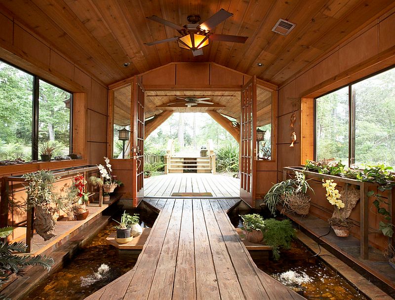 Можете да добавите воден елемент без това да е прекалено екстравагантно. Малко езерце във всекидневната или друга стая, което е покрито със стъкло, ще внесе оригинална нотка към интериора. Разбира се, все още е актуален фонтана на входа на дома, въпреки че това е малко по-пищен вариант.