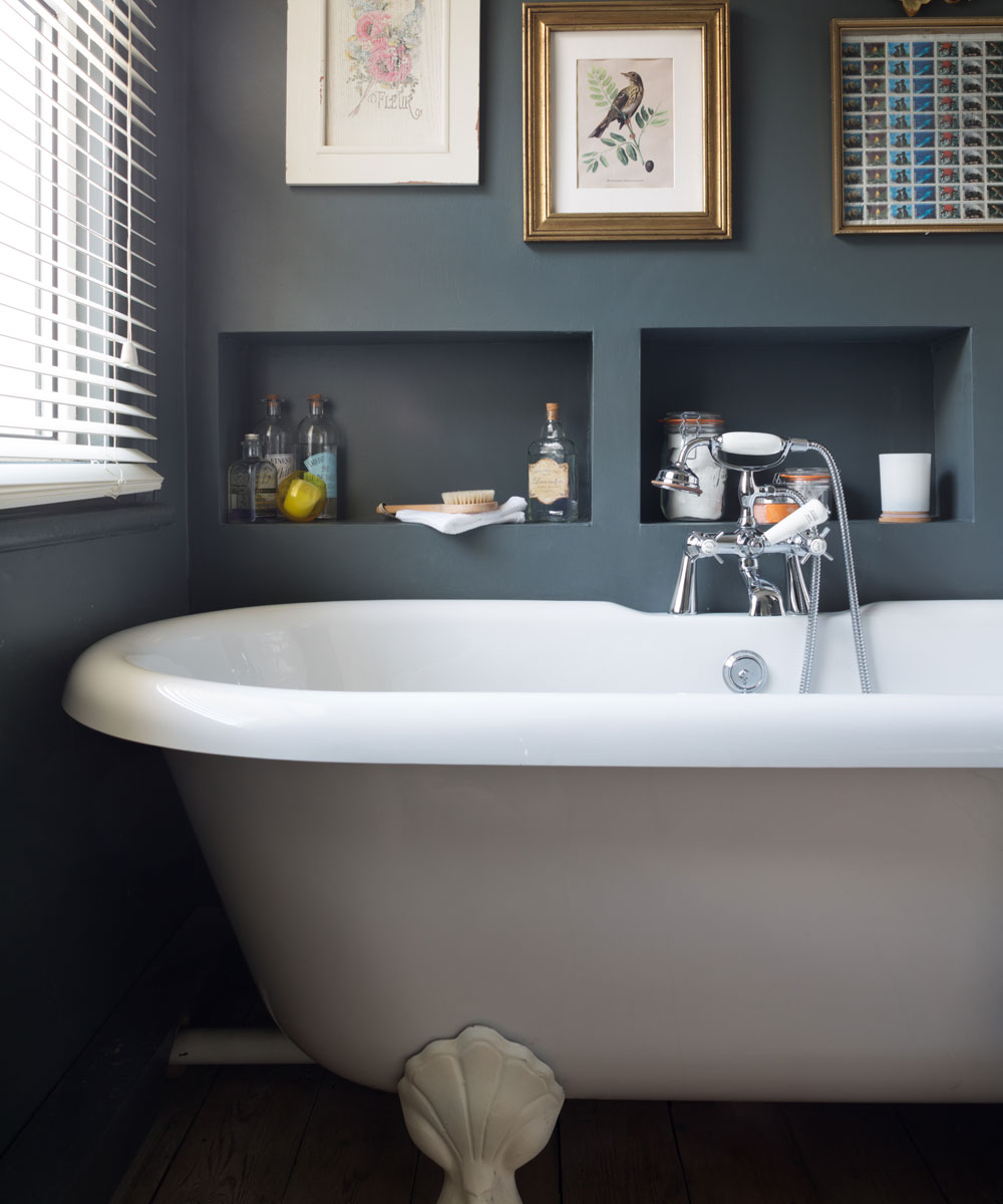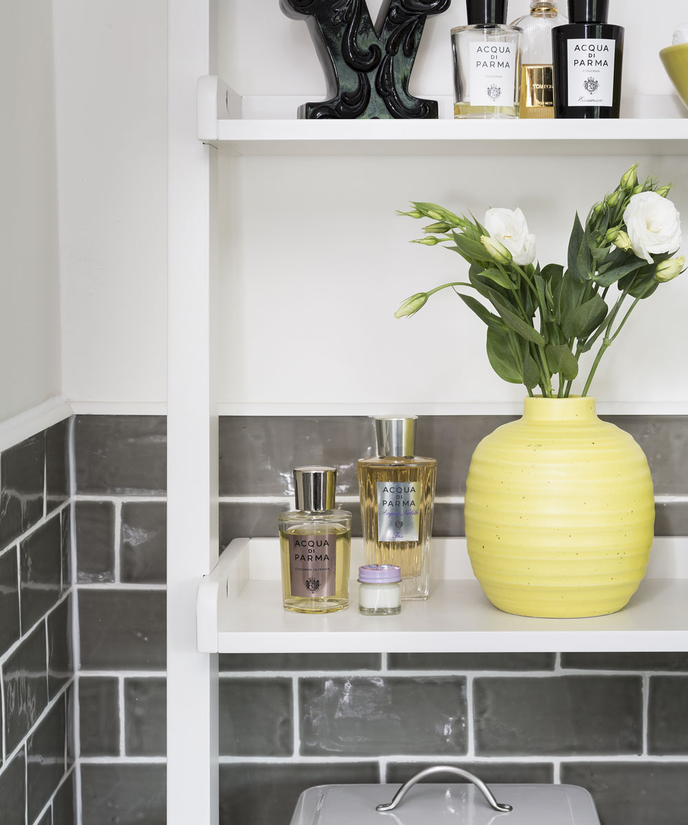 Ако искате да създадете по-смел дизайн, боядисайте лавиците в същия цвят като стените и ги използвайте като стая за експозиции. Тук например е изложена колекция от стари, сложно орнаментирани огледала, това спокойно могат да бъдат снимки в рамки например или колички. Кой казва, че рафтовете са еднотипни? Можете да се позабавлявате изработвайки рафтове с различна големина, форма и плътност и да ги монтирате по интригуващ начин. Малката баня също разполага с места за съхранение на вещи. В тази например има малък шкаф без лице, поставен точно до мивката. Така това са по скоро инсталация рафтове, които ще ви помогнат в малкото пространство да цари ред.