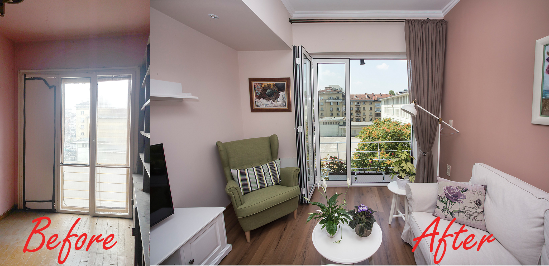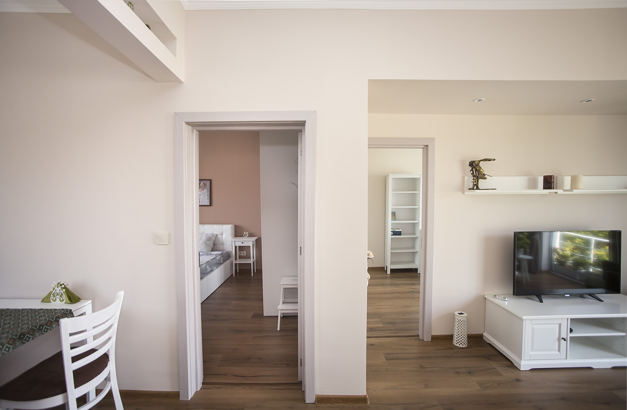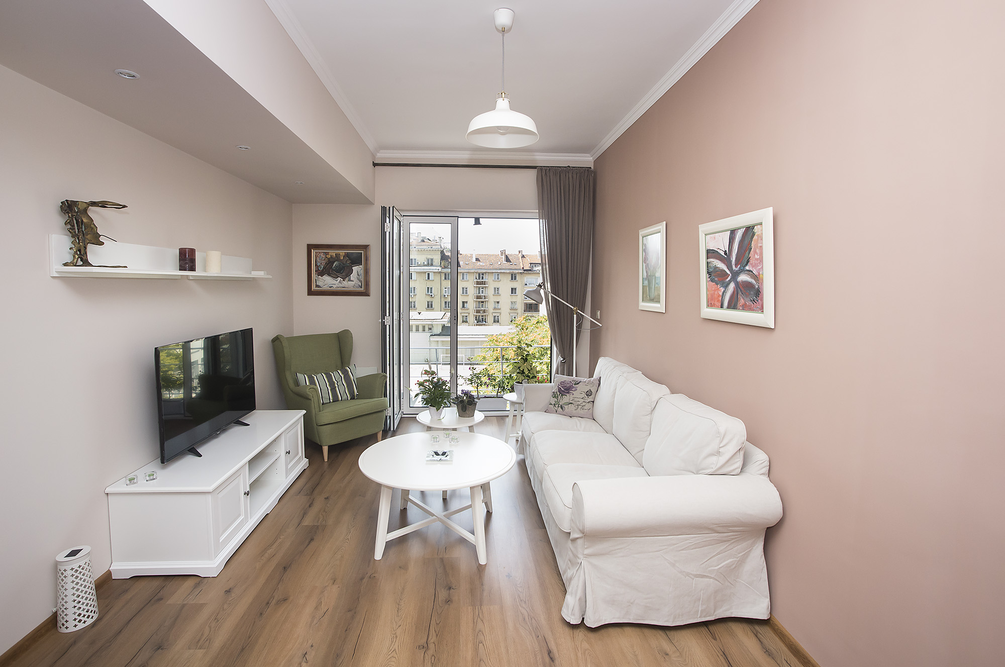 Апартаментът има ествествено предимство и даденост – естествена дневна светлина навлиза през големите прозорци. Свежият вид и настроение се гарантират не само заради саксийните цветя – ефектът се постига и от акцента във всекидневната, а именно зеленото кресло.