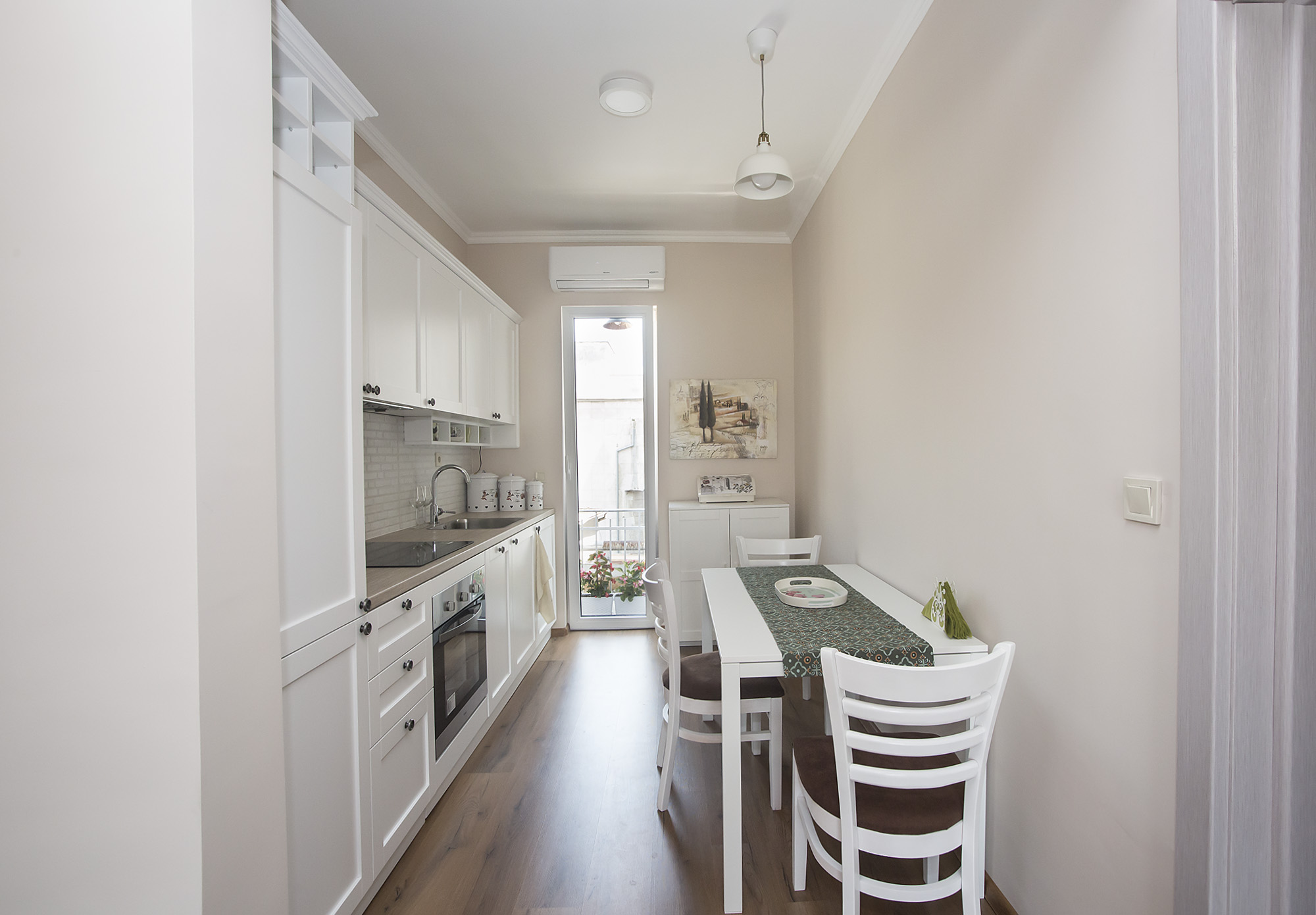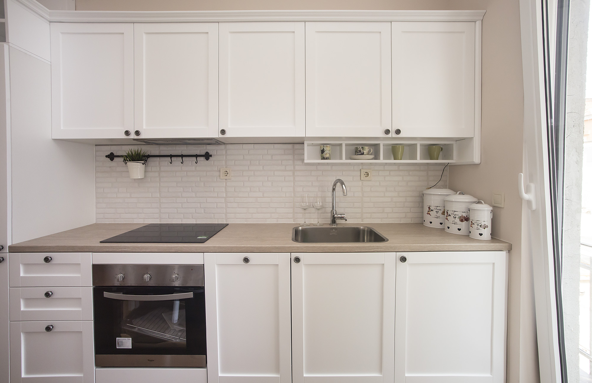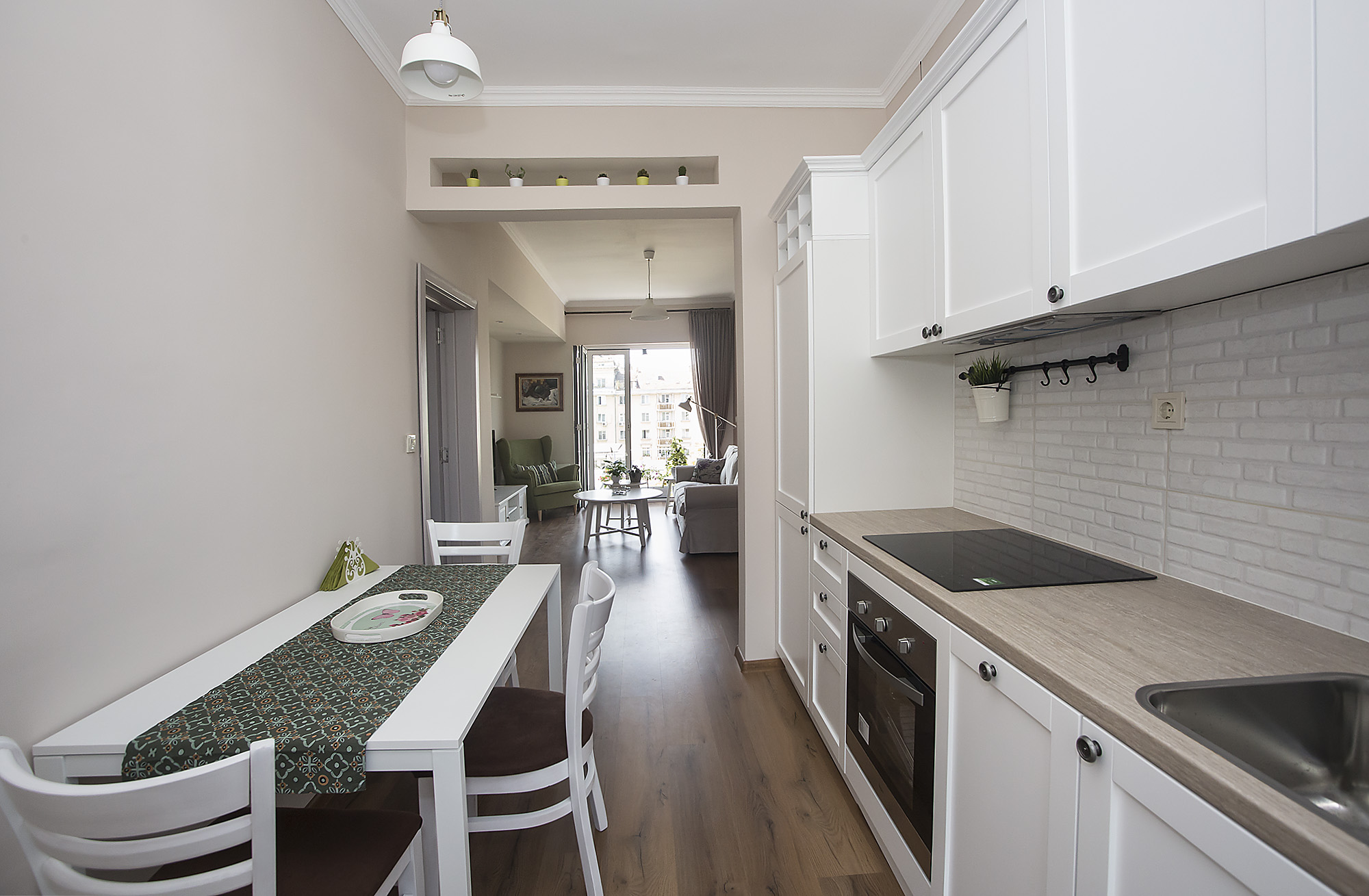 Кухнята е кокетно местенце, решено в преобладаващо бял цвят и отново имаме зелени акценти. Забелязахте ли нещо много любимо на нашия екип? Да! Белите декоративни тухлички са гърба на плота ни карат да се усмихнем. Обожаваме и ретро полъха кухненското пространство!