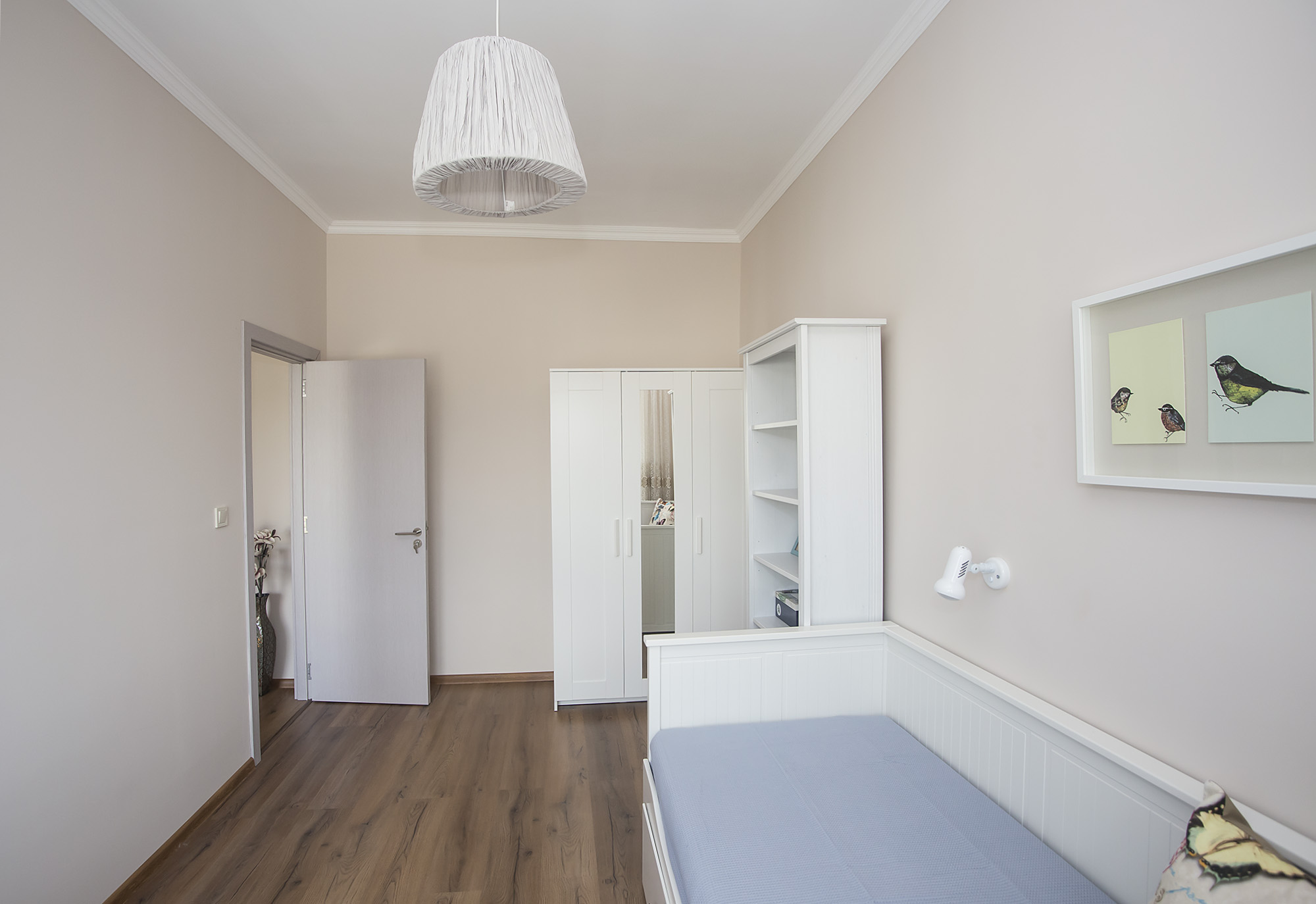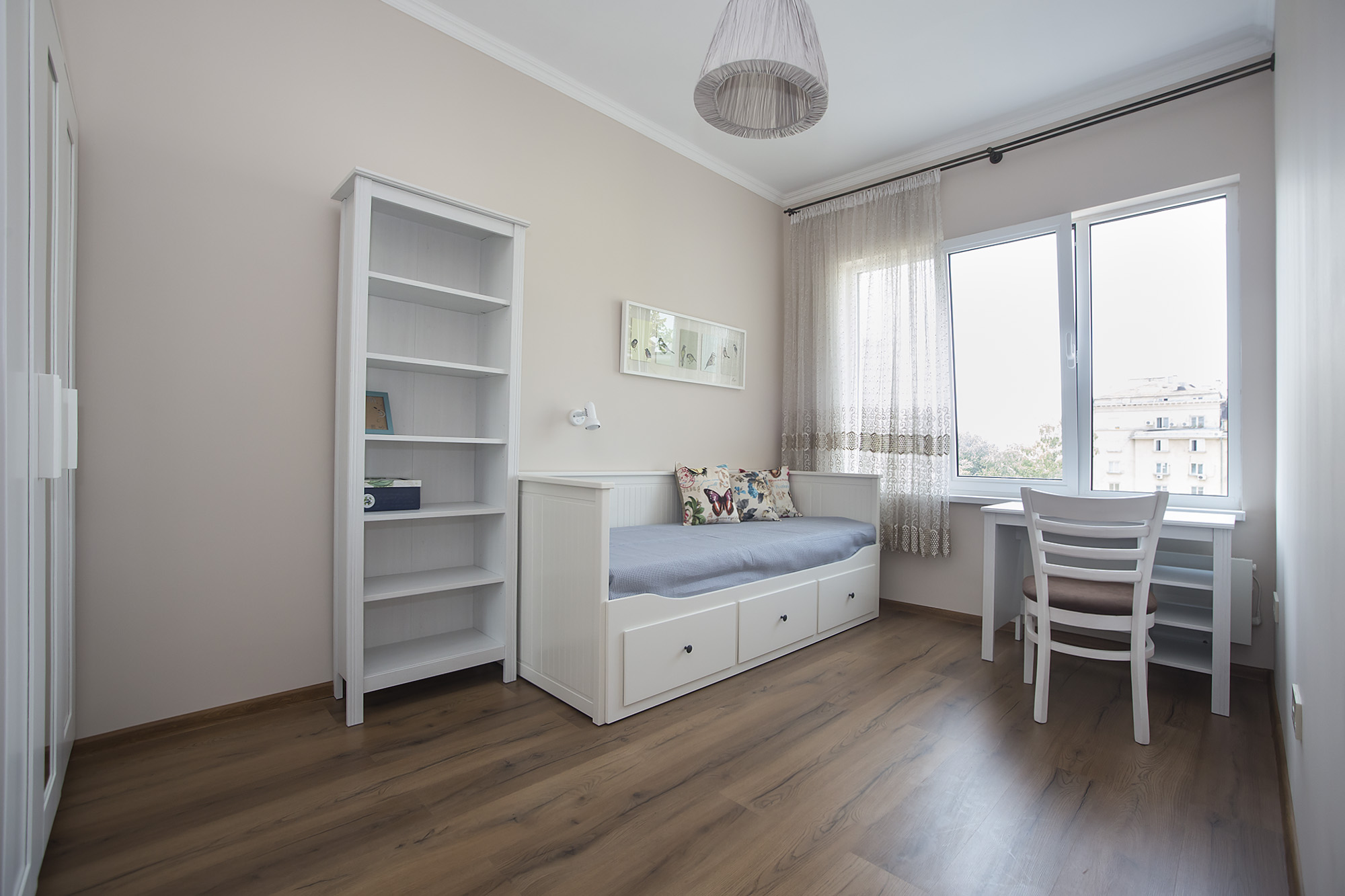 Пастелни светли тонове и нежни аксесоари забелязваме в детската стая. Приветливо местенце, нали?