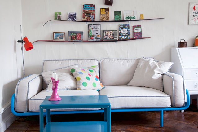 Подреждането на книги като произведения на изкуството над дивана е страхотен акцент. Много харесваме комбинацията между тези разчупени рафтове (изработен от ски!) и равномерно поставените книги и фоторамки.