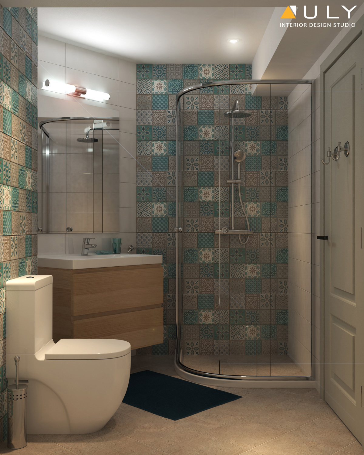 Заиграването със синият цвят е премерено и преминава по стълбата към етаж 2. Преобладават все още актуалните земни тонове за мебелите. Плътните завеси, декоративните възглавнички и нощната лампа са с еднаква шарка, която внася доза романтика в дома. Тюркоазените нюанси се пренасят и в банята.