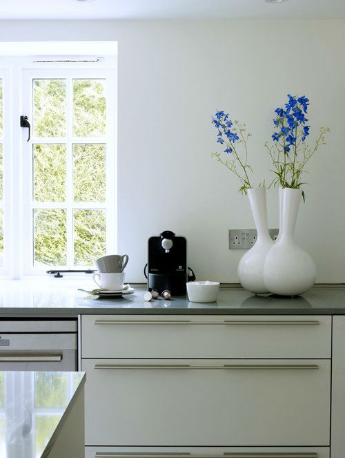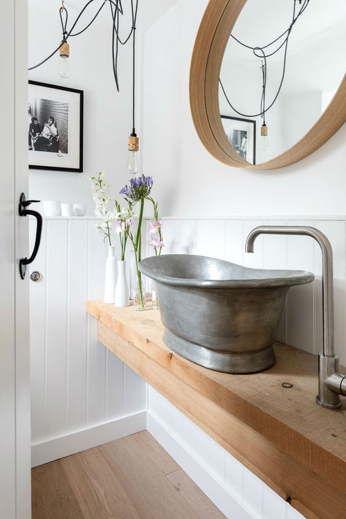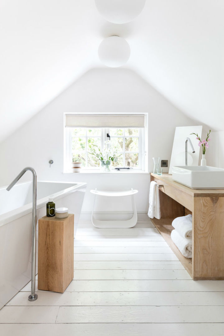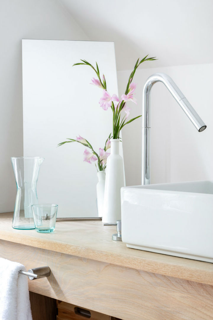Трапезарията обаче, изненадва със прозрачните си столове, интересен трик, за да получите видимо повече свободно пространство, е поне визуално. Кухнята разполага с модерен помощен остров с плот от тъмно дърво и бели шкафове под него. Банята, също е в бяло, а прекрасната мивка, тип корито от неръждаема стомана, поставена върху плот от необработено дърво, е сякаш поставена в изложбена зала, точно заради белият цвят.