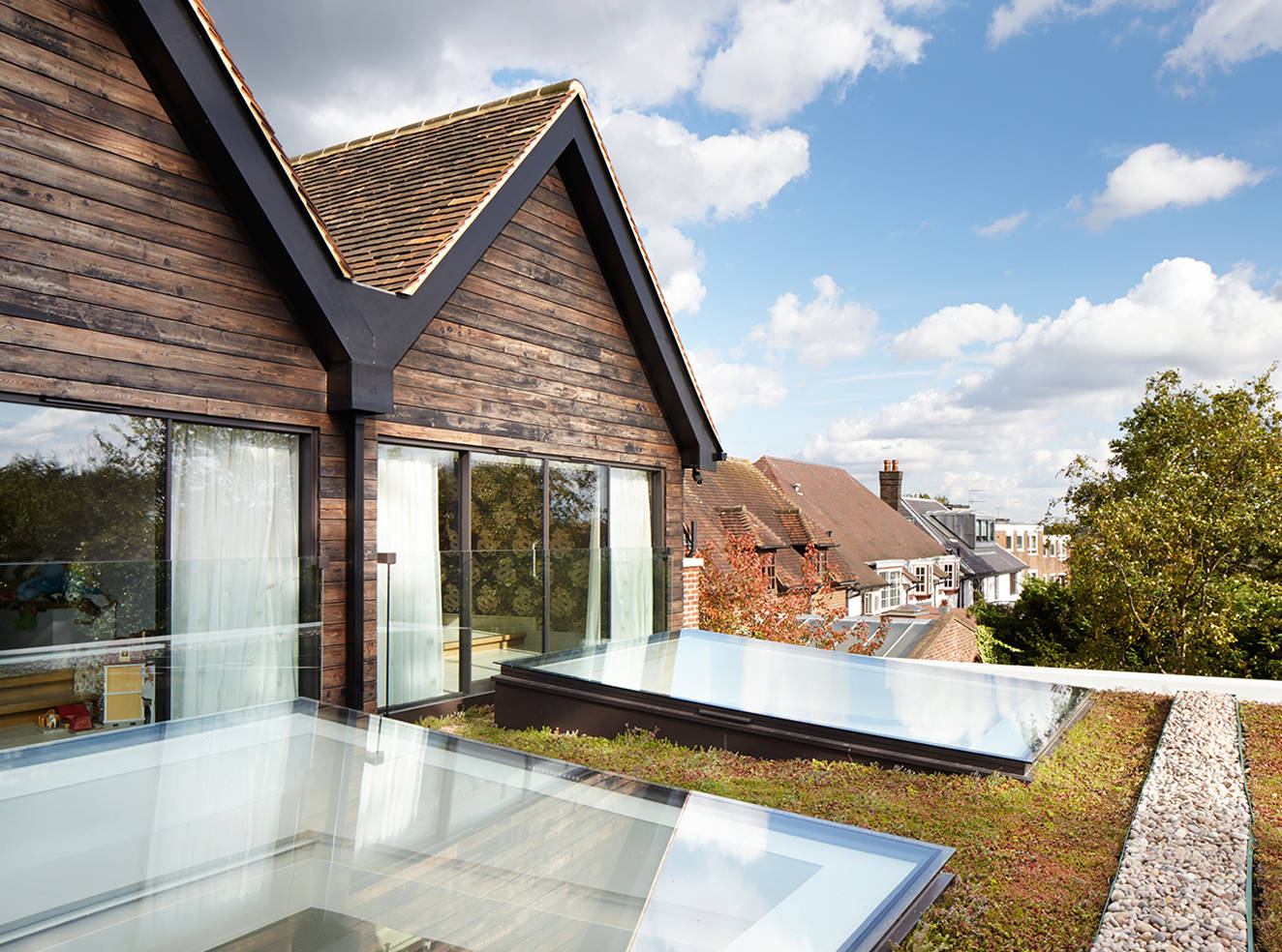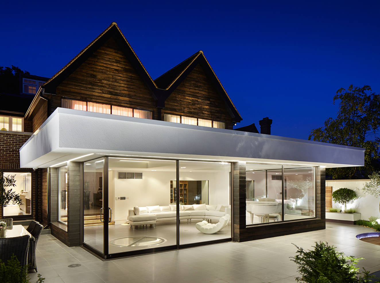 Този проект на къща в Есекс е идеален пример за модерна жилищна архитектура, предлагаща иновативни идеи за такова разширено двуетажно пространство и съчетаваща безпроблемно интериорното и откритото пространство. Нека да разгледаме! Прозрачният приземен етаж е доминиран от големи стъклени панели, предлагащи ясна видимост отвътре навън към градината, като в същото време спалните на втория етаж гледат към зеления покрив.
