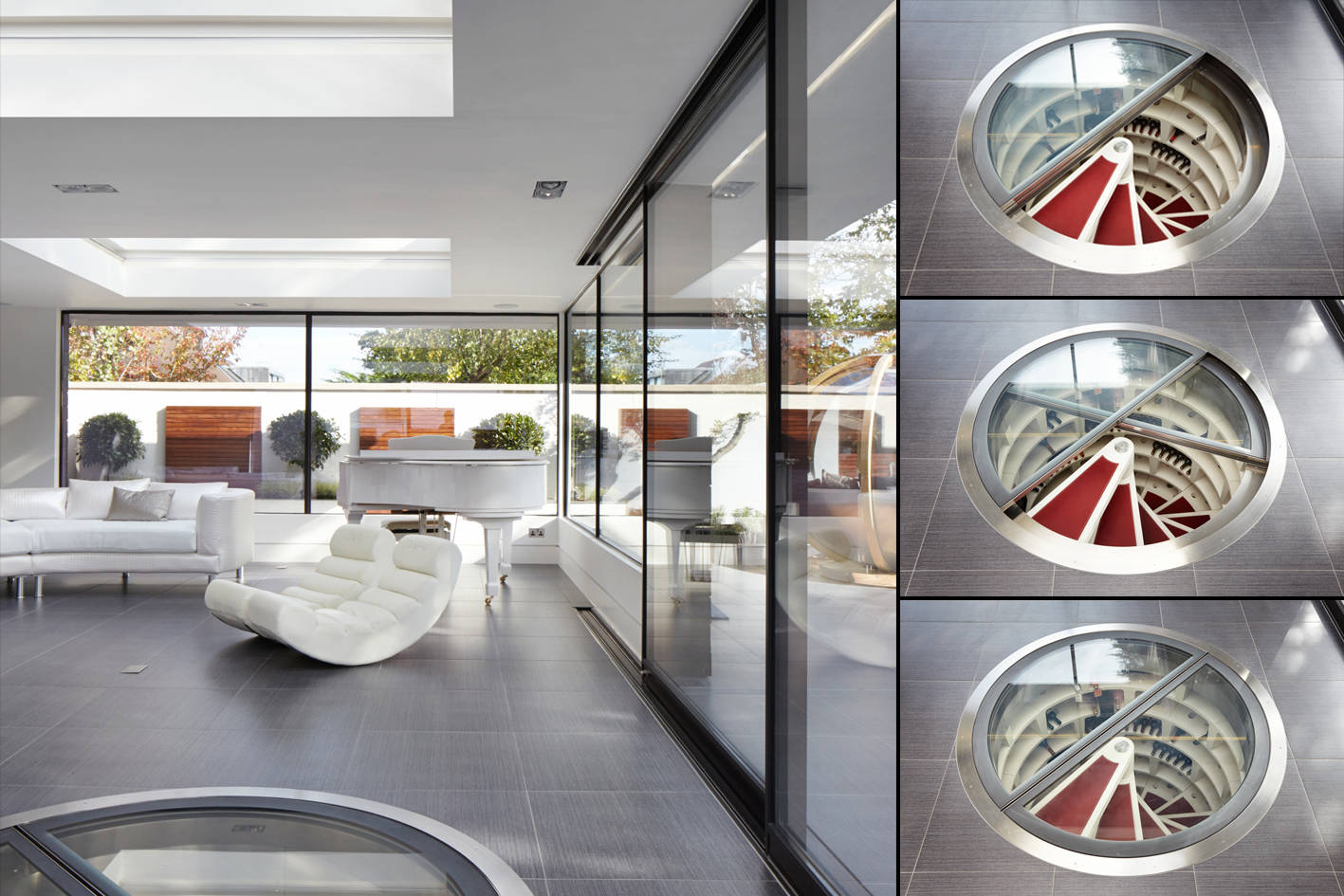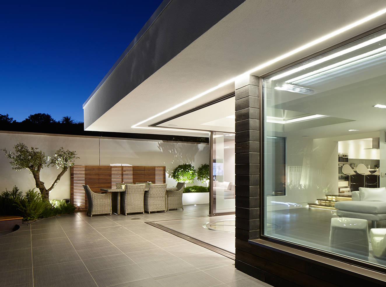 Ненапразно вътрешното пространство е наречено „вътрешна градина“ – действително това е усещането, с цялата тази светлина, простор и с допускането сякаш без преграда на зеленината и природата вътре в самата къща. А плавният преход между закрито и открито пространство е направен много умело и елегантно, чрез използване на същия материал и еднакви плочки, за да изглежда границата почти незабележима. Друг акцент на тази разположена повече в ширина къща е мястото на избата за съхранението на отбрани бутилки вина. На горния етаж е добавена нова спалня, като основната е същевременно доста разширена и двете предлагат изглед към градината и зеленината, която е оформена на покрива. Това е и другата впечатляваща забележителност на къщата, като нейната просторност, симетрия и огледалност са подчертани и в зеленината на покрива.