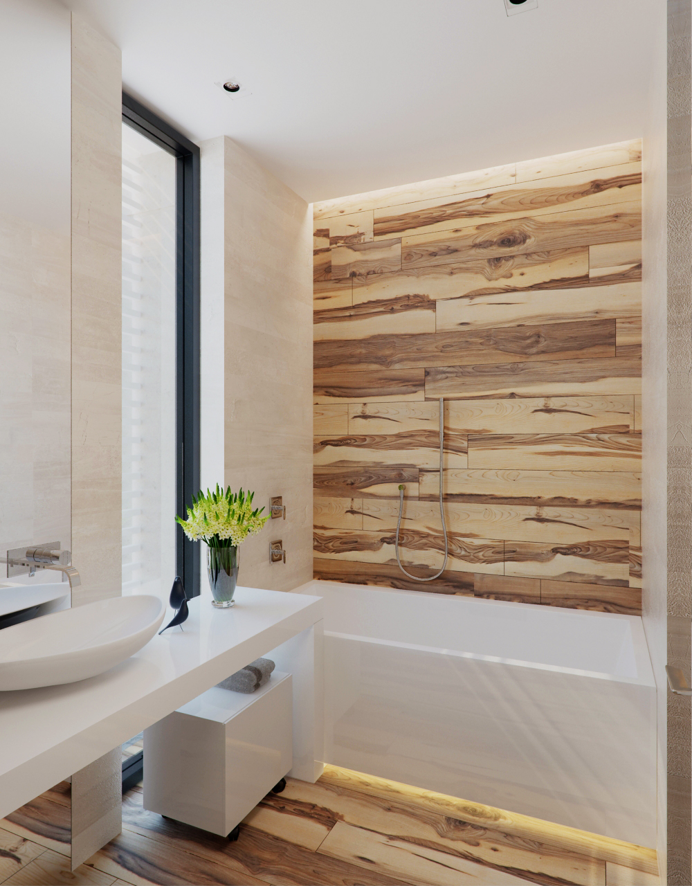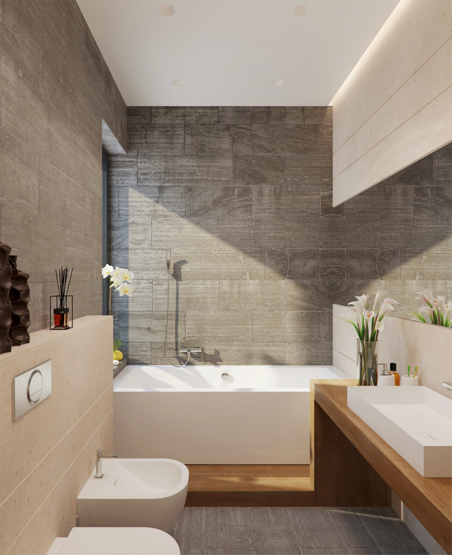 Баните в дома са особено луксозни с използването на лъскави дървени акценти и красиви каменни текстури, като дори е подчертано пространството за нея и него. В завършеното мазе е използвано още веднъж силата на едно креативно осветление с интересен грозд от осветителни тела над масата за билярд.