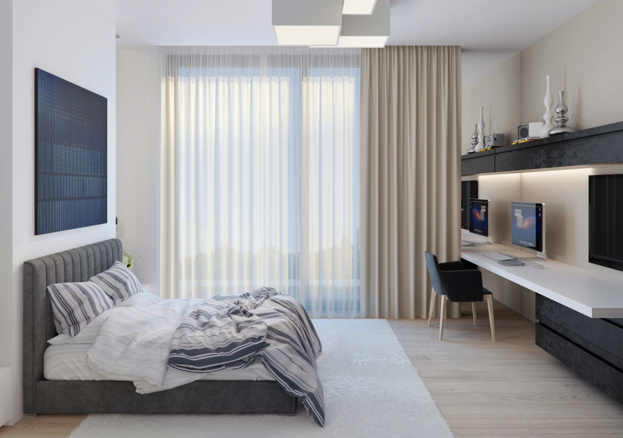 Над трапезарията, както и над хола, осветителни тела с креативни форми привличат вниманието с блясък и яркост. След плаващите прозрачни стълби на втория етаж са разположени спалните, стаята за гости и изискан офис-кабинет. Както при всеки модерен семеен дом, желанието да се запазят детските стаи съобразно възрастта на децата, изисква подходящ дизайн, който тук е в унисон с останалите помещения. Дори да изглеждат малко хладни и неутрални, достатъчното пространство и обзавеждане им придава специфичното спокойствие и лукс, които излъчва самият дом.